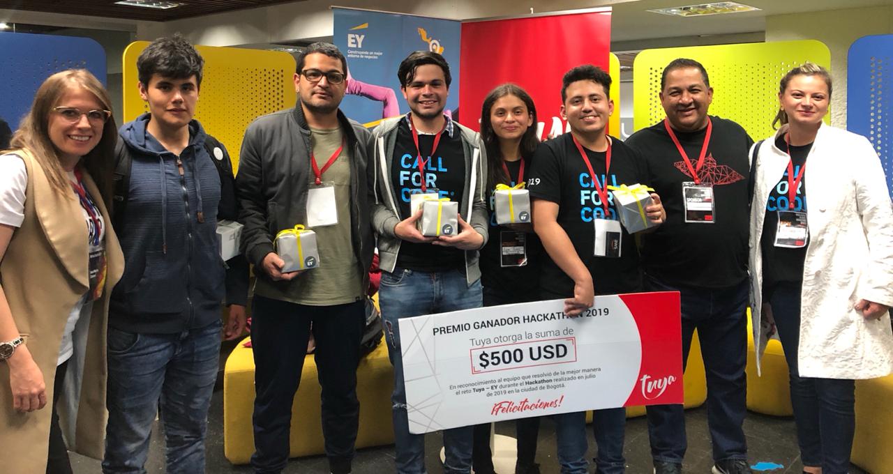 Ana María Gómez, senior manager de Consultoría de EY Colombia; Jonathan Torres, Carlos García, Juan Pulido, Laura Forero, Juan Patiño, Mario López, jefe de innovación de Tuya; y Yuri Valencia, vicepresidente de estrategia e innovación de Tuya.
