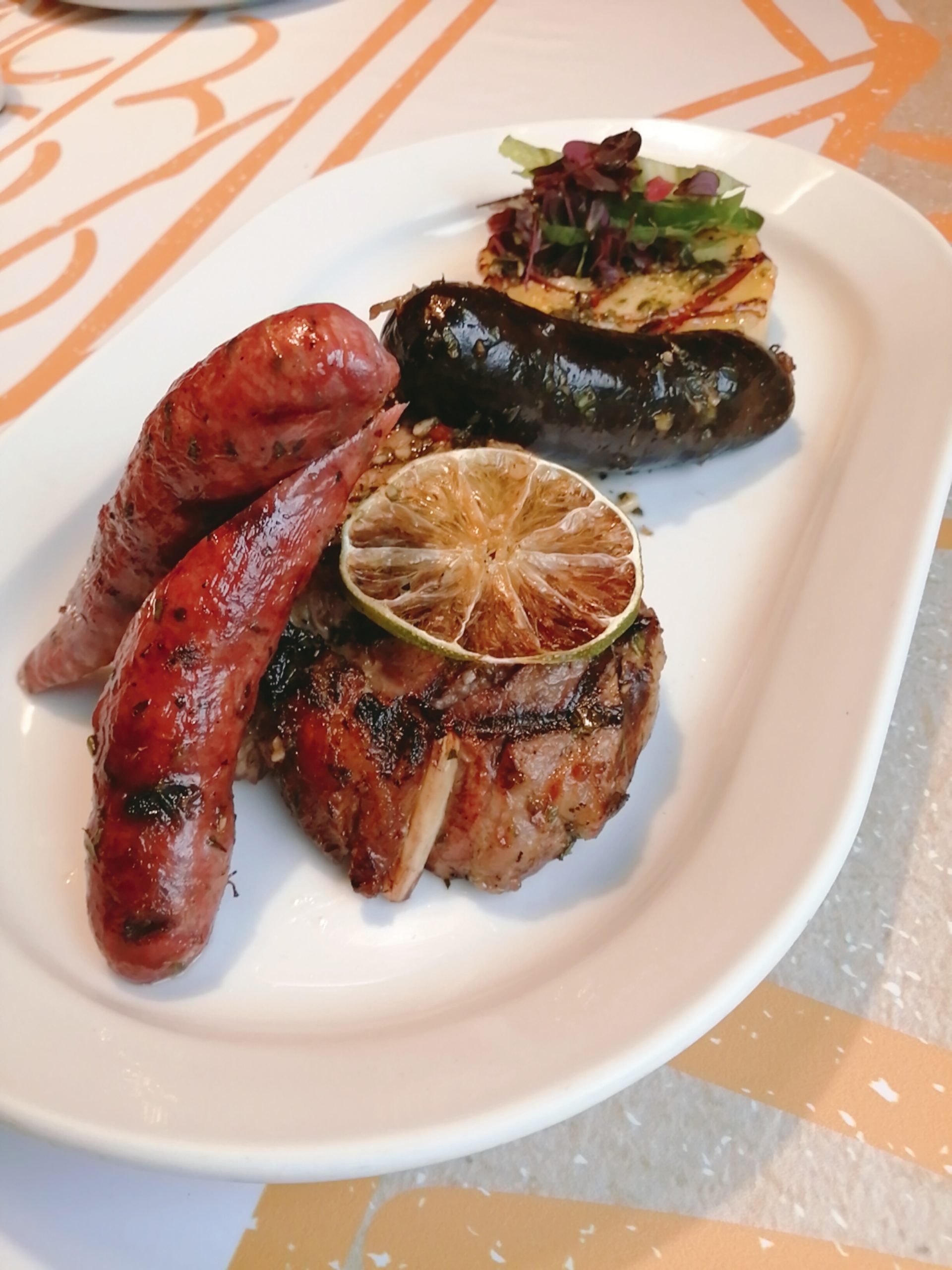 Un bife chorizo wagyu de 250 gramos, una morcilla estilo porteño más cargada de relleno; un chorizo de res y una provoleta, que es un queso Provolone a la parrilla para acompañar la mezcla.