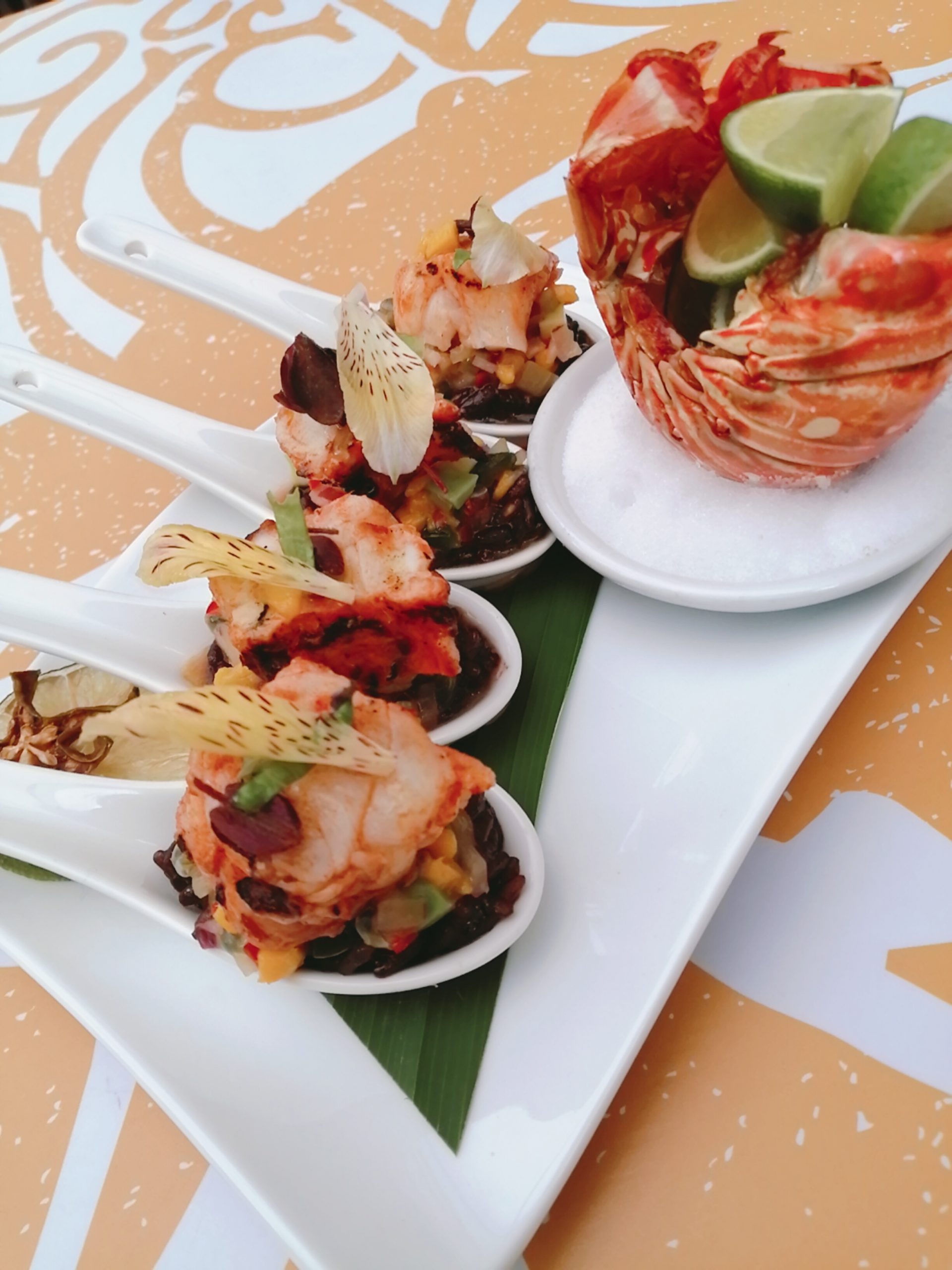 Estas son unas cucharitas con base de arroz meloso, un picadillo arequipeño y arriba está montado con un trozo de cola de mini langosta de cuba a la mantequilla de ajo confitado y gengibre.