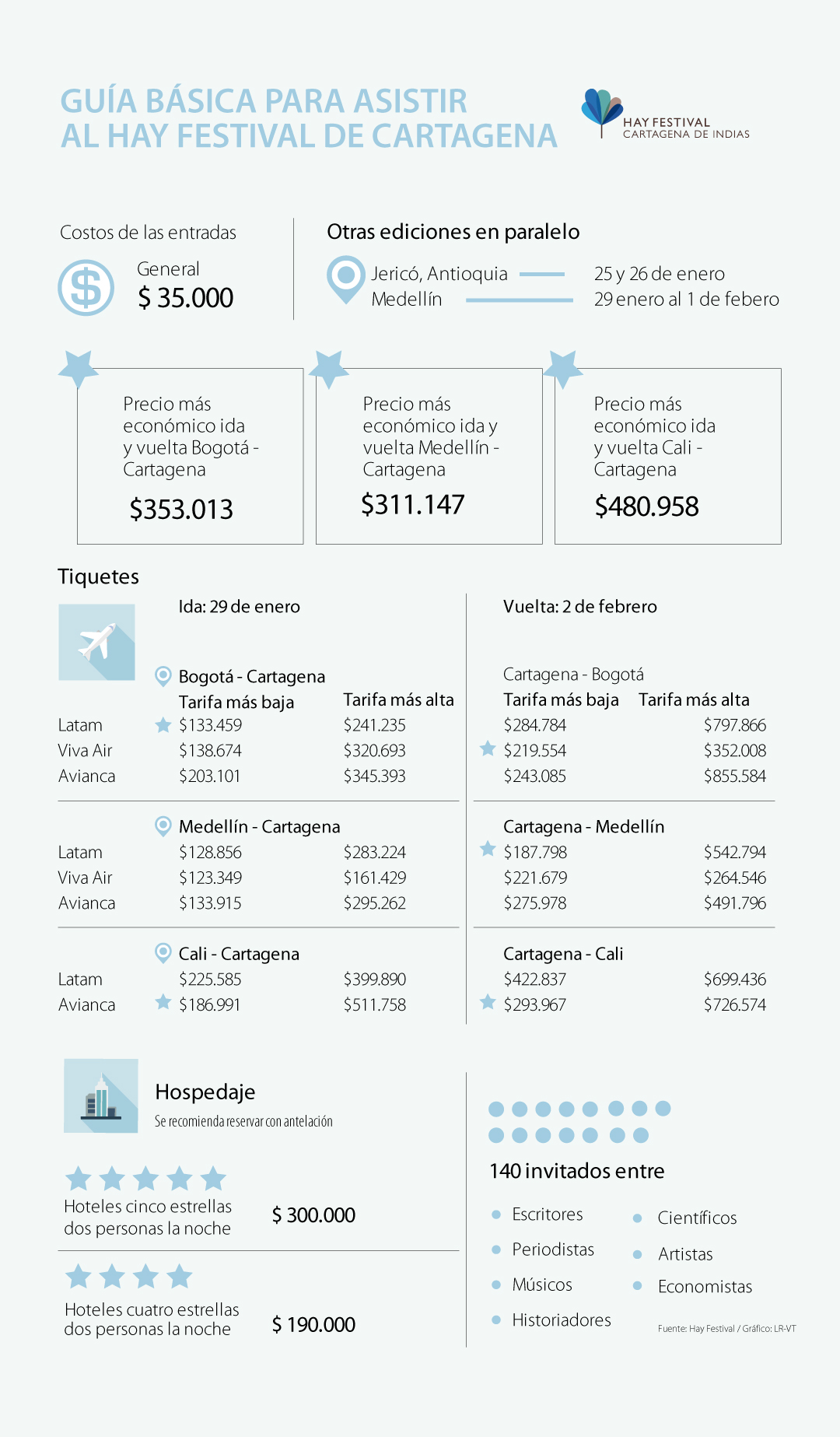El evento inicia el jueves, y para las fechas los tiquetes para viajar desde Bogotá hacia Cartagena el miércoles van desde $133.459 hasta $345.393; desde Cali desde $186.991 hasta $511.758, y partiendo de Medellín las tarifas están entre los $123.349 y $295.262.