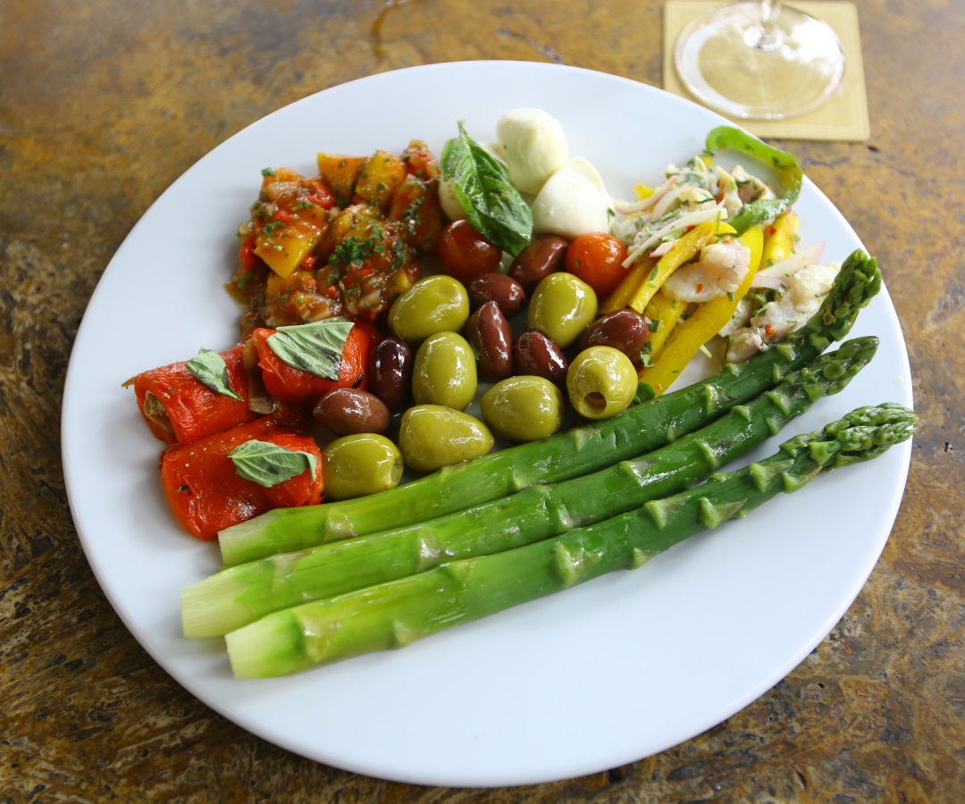 Un plato armado con espárragos, aceitunas, pimentón, ceviche, mango y hasta queso.