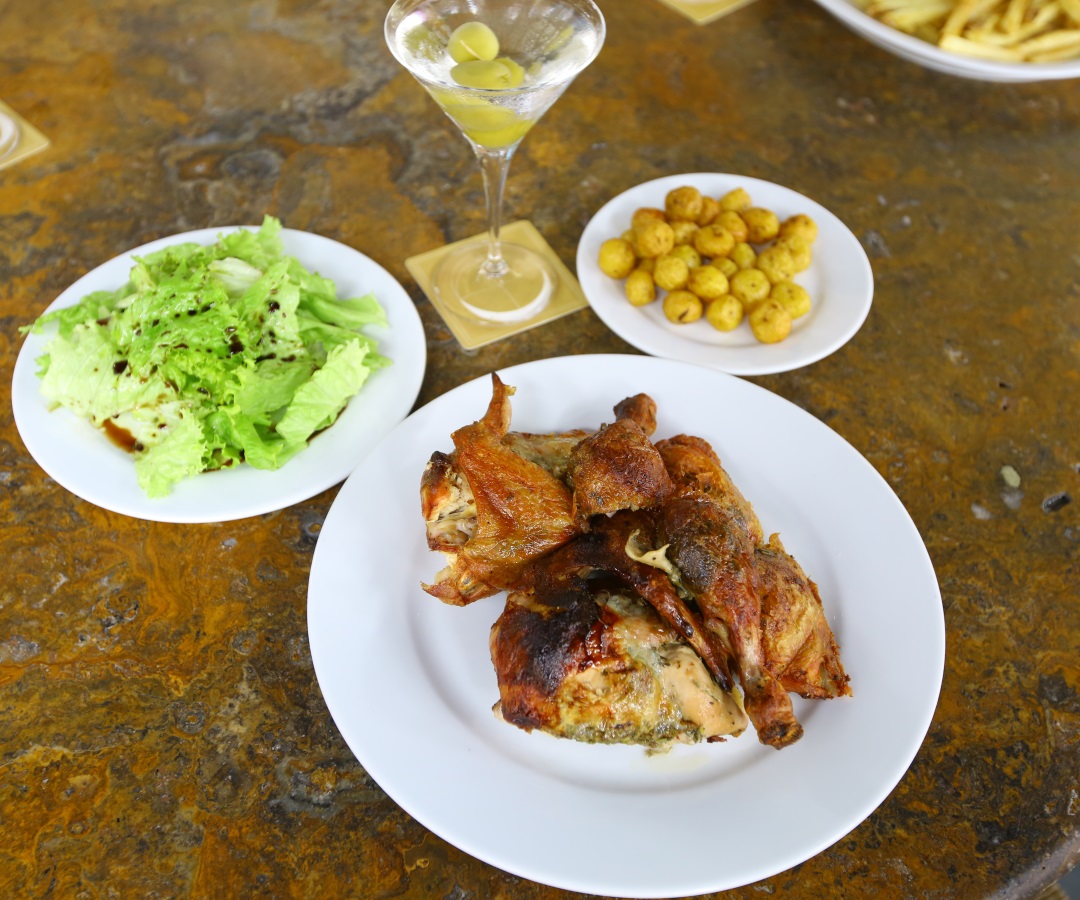 El clásico pollo rostizado acompañado con papa criolla y una ensalada de la casa.