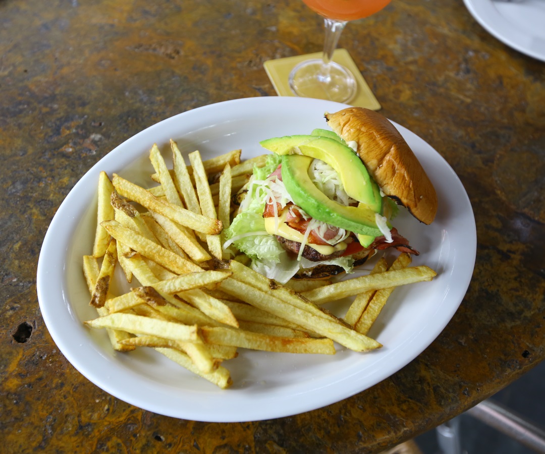 Una versión gourmet de la clásica hamburguesa acompañada de papas a la francesa y aguacate.