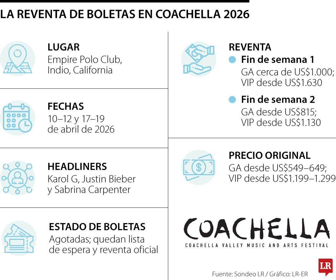 La reventa oficial muestra que los pases generales de tres días para el primer fin de semana y las admisiones generales con shuttle rondan los US$1.000, mientras que los VIP comienzan desde US$1.630. Para el segundo fin de semana, los precios bajan un poco, pero siguen altos: los pases generales arrancan en US$815 y VIP desde US$1.130.