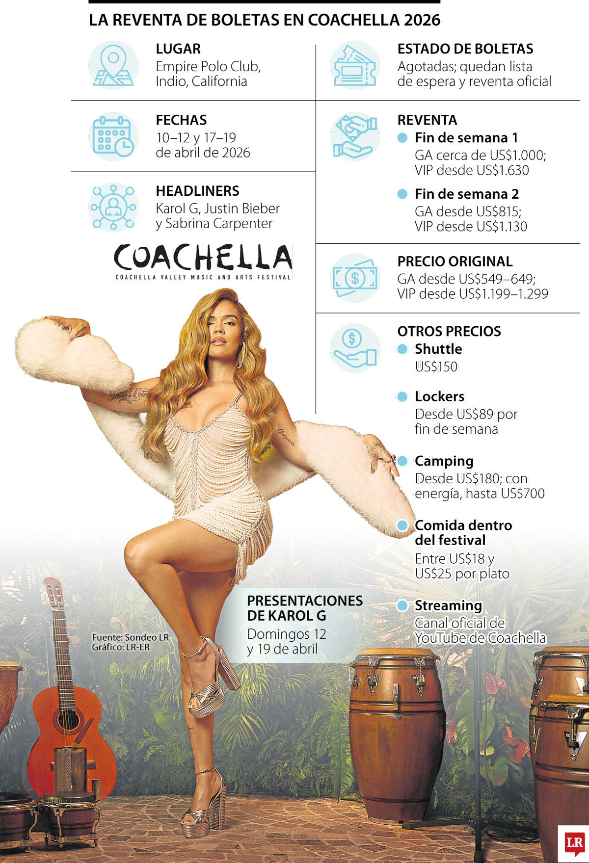 La presión sobre la boletería no se explica solo por el peso histórico del festival, sino también por el cartel de este año. Karol G es una de las razones centrales. La artista colombiana se convirtió en la primera del país en encabezar Coachella, un hecho que la instala como uno de los mayores símbolos de esta edición y que ha contribuido a elevar la expectativa.