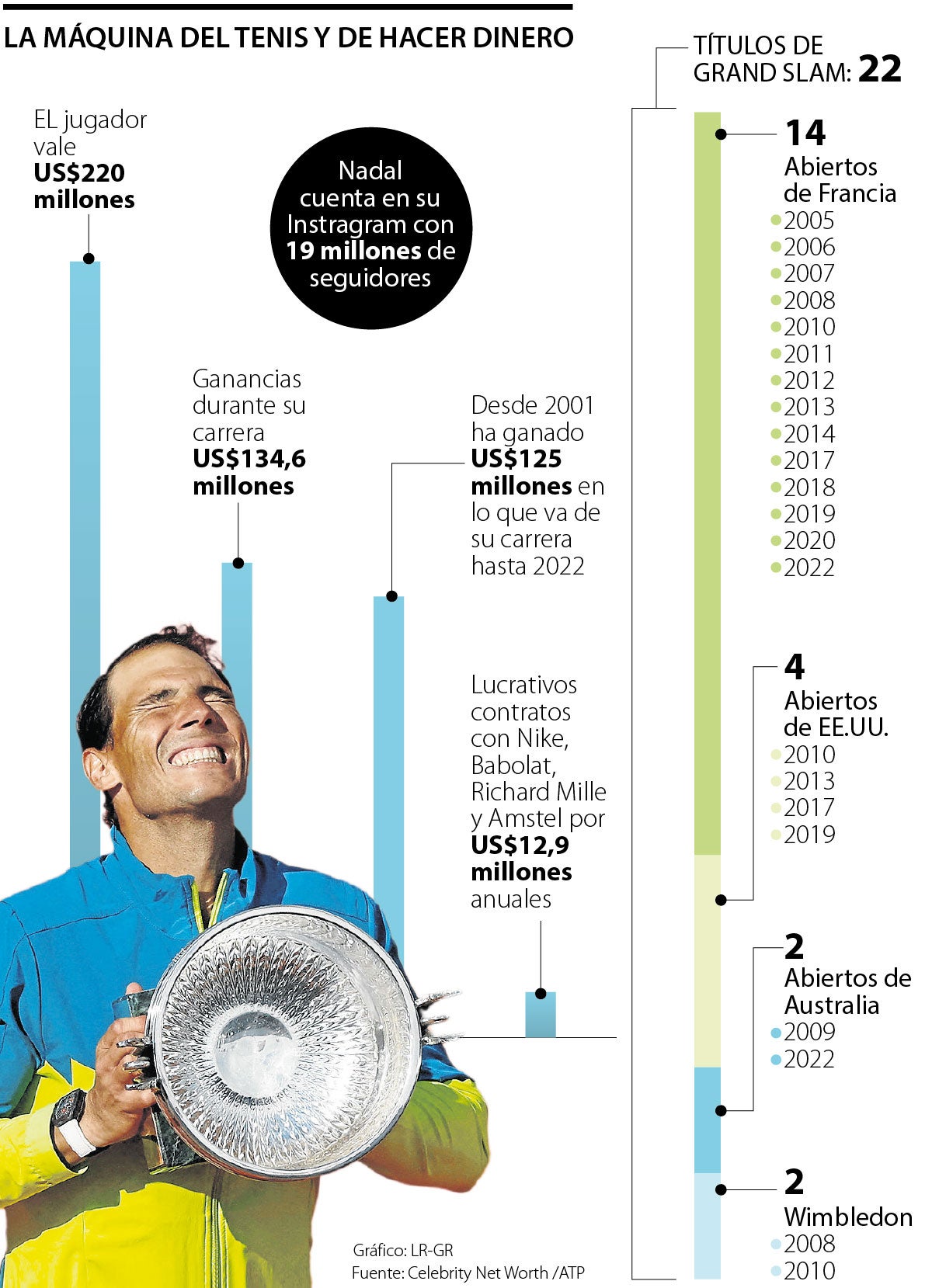 Adicional al hotel que abrirá en Mallorca junto al Meliá Hotels International, le entra plata por todo lado. Tiene patrocinios con Nike, Babolat, Richard Mille y Amstel, lo que le genera más de US$12 millones al año. Sin contar el acuerdo que hizo con KIA, marca de la que es embajador y que promociona por los lugares del mundo a los que viaja a desplegar su talento y revés endemoniado en los torneos.