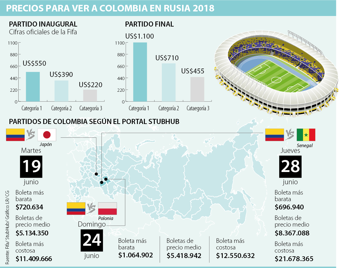 Aunque la Fifa dio unos rangos oficiales por categorías, el diario LR hizo un sondeo de los precios que se pueden ver en algunas plataformas de compra y venta de boletas, como por ejemplo StubHub. En este caso, si usted comprara la boleta en este momento, los aficionados podrán ver a la Selección Colombia por un precio mínimo de $720.634, valor que corresponde a un solo partido.
