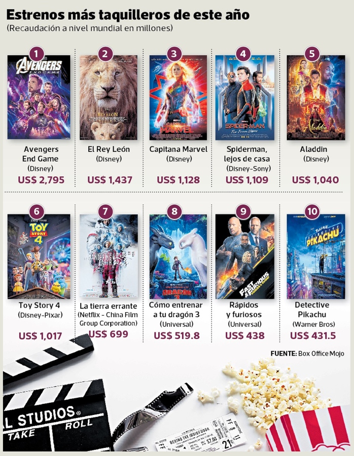 Por si fuera poco, seis de los nueve filmes de la empresa estrenados este año, a la fecha superaron los US$ 1,000 millones en recaudación: "El rey león", "Capitana Marvel", "Aladdin", "Spiderman" (distribuida por Sony) y "Toy Story 4".