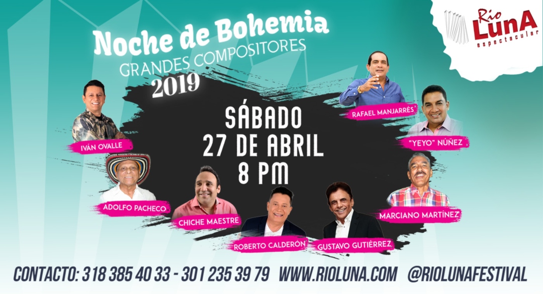 Este sábado desde las 8:00 p.m. Iván Ovalle, Rafael Manjarrés, Yeyo Núñez, Marciano Martínez, Gustavo Gutiérrez, Roberto Calderón, Chiche Maestre y Adolfo Pacheco estarán en Río Luna, en el norte de la ciudad, en una parranda que promete ir hasta el amanecer. Habrá servicio de bar, restaurante y parqueadero. Adquiera sus entradas en tuboleta.com