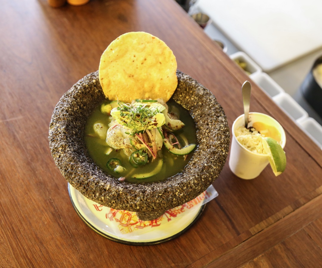Camarones crudos marinados en una preparación de cilantro, jalapeño, pepino y limón, y servidos con aguacate, cebolla morada y un totopo en un molcajete, el mortero tradicional mexicano hecho en piedra.