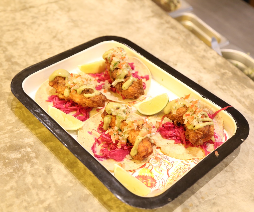 Tacos de pescado apanado con repollo encurtido en una tortilla de maíz hecha en el local. En ese proceso, el maíz pasa por un molino de piedra volcánica y luego se cocina en la máquina de tortillas, única en el país.