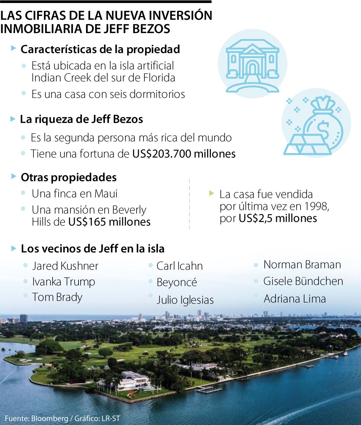 Bezos, la segunda persona más rica del mundo con una fortuna de US$203.700 millones, según el Índice de Multimillonarios de Bloomberg, anunció en noviembre que se mudaba a Miami desde la región de Seattle. Desembolsó US$147 millones por dos mansiones en Indian Creek, una isla barrera artificial tan famosa por su riqueza que es apodada "Billionaire Bunker". Otros residentes son Jared Kushner e Ivanka Trump, Tom Brady y Carl Icahn.