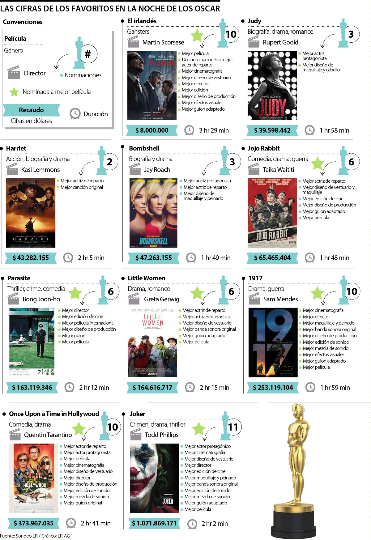 De hecho de las favoritas, solo se destaca con fuerza el recaudo de Joker, que logró US$1.071 millones y tienen 11 nominaciones. De lejos está la segunda, Once upon a time in Hollywood, la cinta con 10 nominaciones que logra US$373 millones.