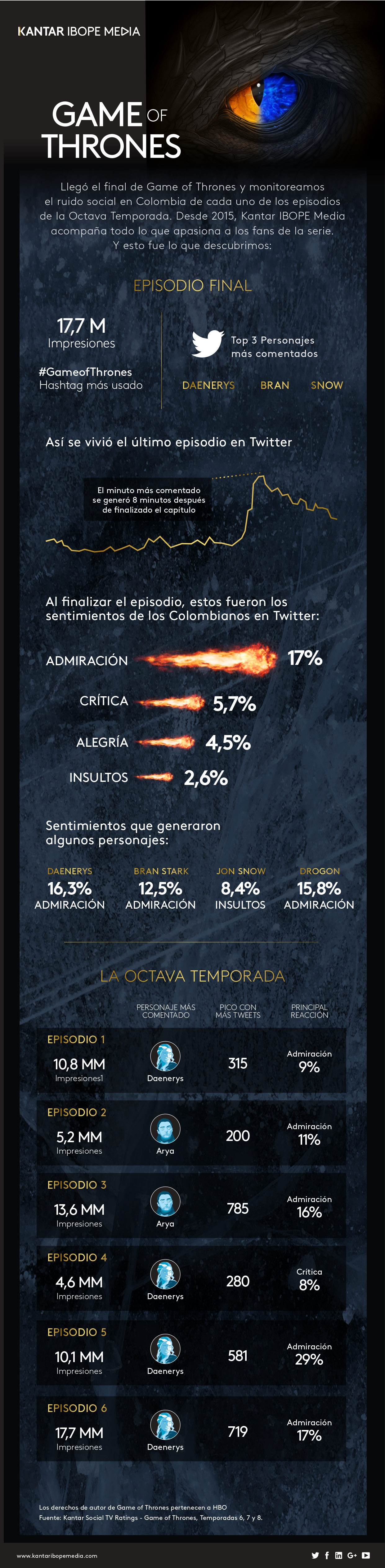 Colombia fue el segundo país de Hispanoamérica que más usó Twitter para hablar de #GOT, luego de Argentina. En tercer lugar, estuvo Chile. El episodio más comentado fue el tercero. Mientras que en el primer episodio del 14 de abril hubo 300 tuits en el minuto más comentado, el último lo superó más del doble, con 719 tuits en Colombia en sólo un minuto.