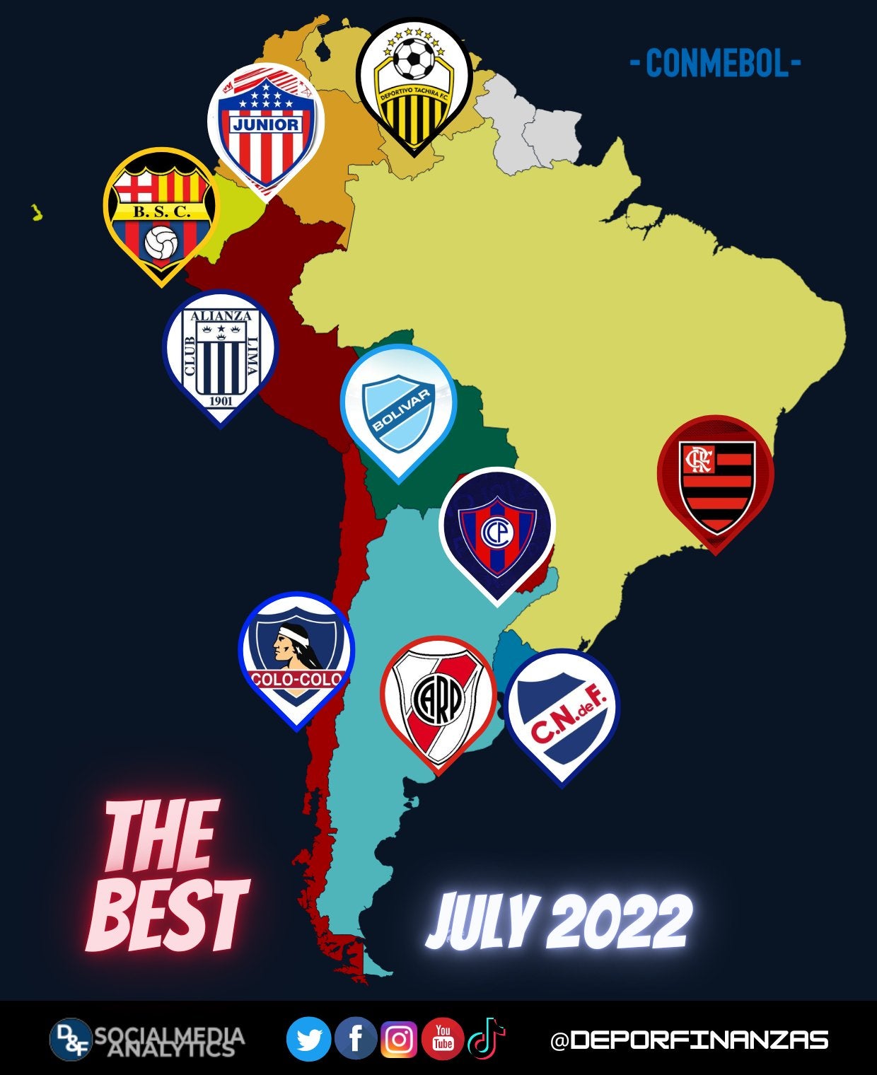 Según Deporte y Finanzas, a través de métricas de Social Media Analytics, los clubes de la Conmebol con mayor interacción en redes sociales durante julio de este año fueron: River Plate, de Argentina, Junior de Barranquilla, Colombia, Flamengo de Brasil, Nacional de Uruguay, Cerro Porteño de Paraguay, Colo Colo de Chile, Club Bolívar de Bolivia, Barcelona de Ecuador, Club Alianza Lima del Perú y Deportivo Táchira de Venezuela.