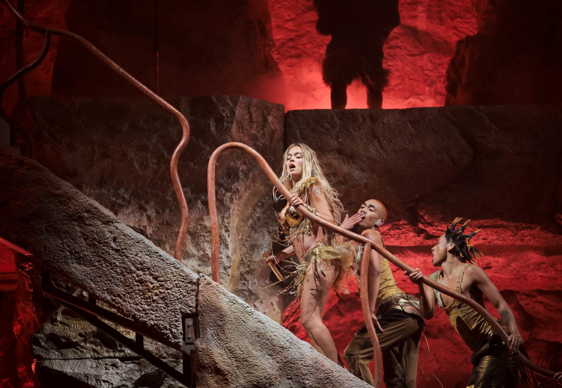 El espectáculo arrancó con fuerza con su tema “Latina Foreva”, perteneciente a su álbum Tropicoqueta, lanzado el año anterior. Vestida con un llamativo bikini dorado, Karol G desplegó una coreografía vibrante que evocaba la energía escénica de Shakira, acompañada por un amplio grupo de bailarines que aprovecharon cada rincón de un escenario diseñado como una imponente cueva de piedra. La escenografía, lejos de ser simple, combinaba elementos naturales con tecnología, fuego, humo y niveles múltiples que permitían una dinámica constante.