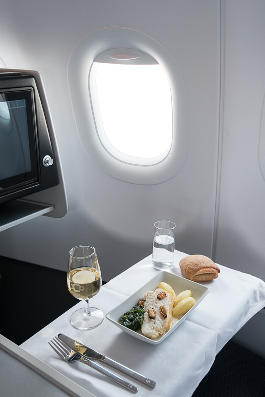 Con unos relajantes colores azulados y grisáceos en toda la cabina que evocan el firmamento, los mejores asientos del aparato se encuentran de las filas 1 a la 9, ya que ofrecen más espacio para las piernas. En el ámbito del entretenimiento, Zodiac Inflight Innovations montó una pantalla táctil de 15,7 pulgadas, además de ofrecer auriculares con cancelación de ruido. Por supuesto que el WIFI (cortesía de Viasat) es gratuito y de velocidad supersónica. El catering y algunos platos sofisticados corren a cargo de chefs franceses con estrella como Christophe Langrée y Frederic Duca (Paleta de cordero confitada con aceite de oliva y hierbas, barigoule de alcachofas, condimento de cítricos) y la carta de vinos es meritoria. Todos los pasajeros son agasajados con una copa de bienvenida de champán Piper Heidsieck.