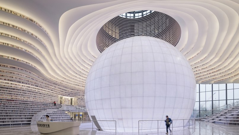 Se llama Tianjin Binhai y, a pesar de que cuenta con 200.000 ejemplares y planea hacerse con un total de 1,2 millones, lo realmente llamativo e impactante es su estructura de 30 metros de altura y 33.700 metros cuadrados. Dividida en seis plantas, las cuales imitan los pasillos de una biblioteca común, su punto más llamativo es el ojo esférico situado en el centro del edificio, ideado para realizar presentaciones y conferencias.