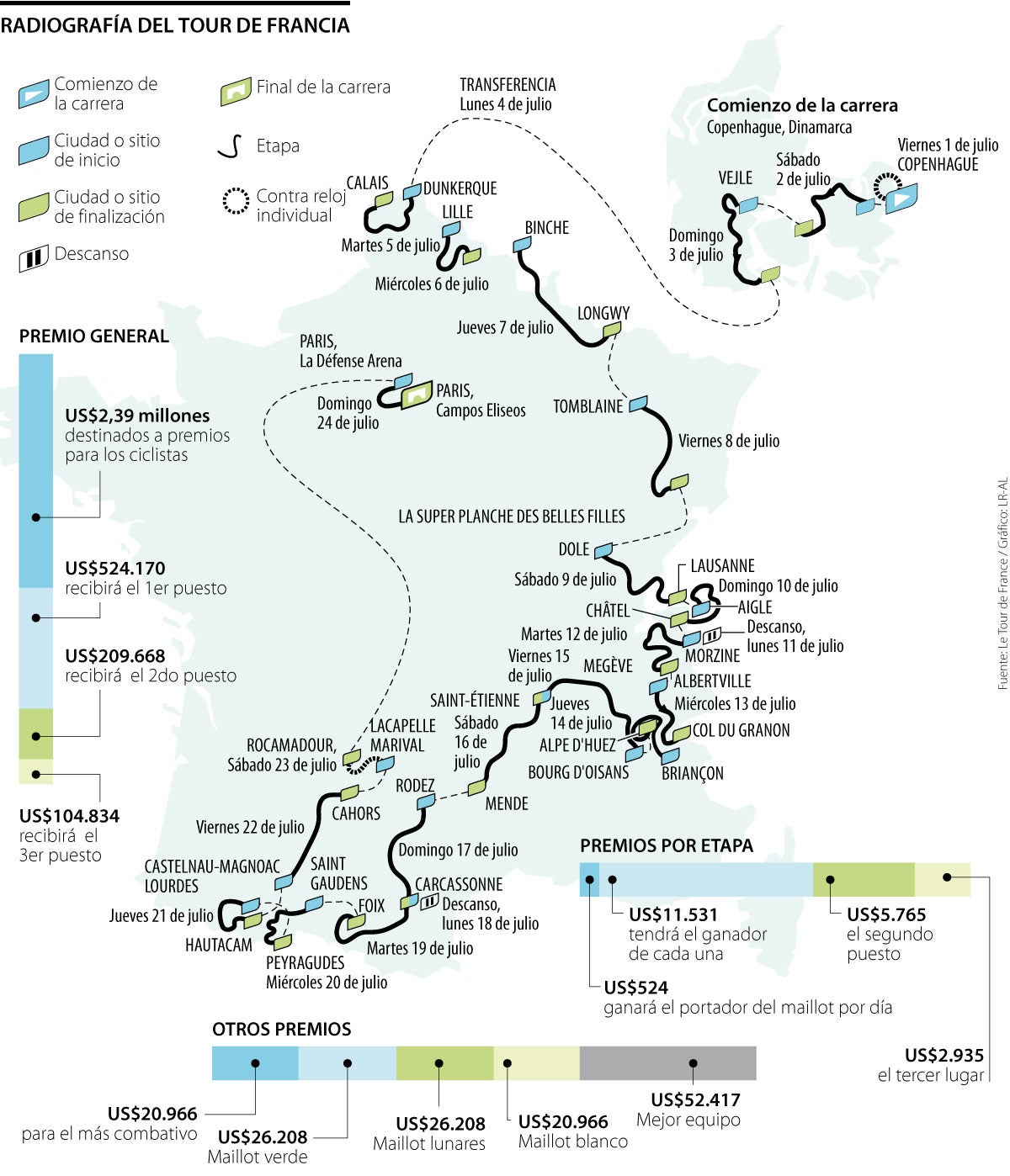 El recorrido atravesará cuatro países (Dinamarca, Suiza, Bélgica y Francia), 39 ciudades sedes, 29 departamentos y ocho regiones