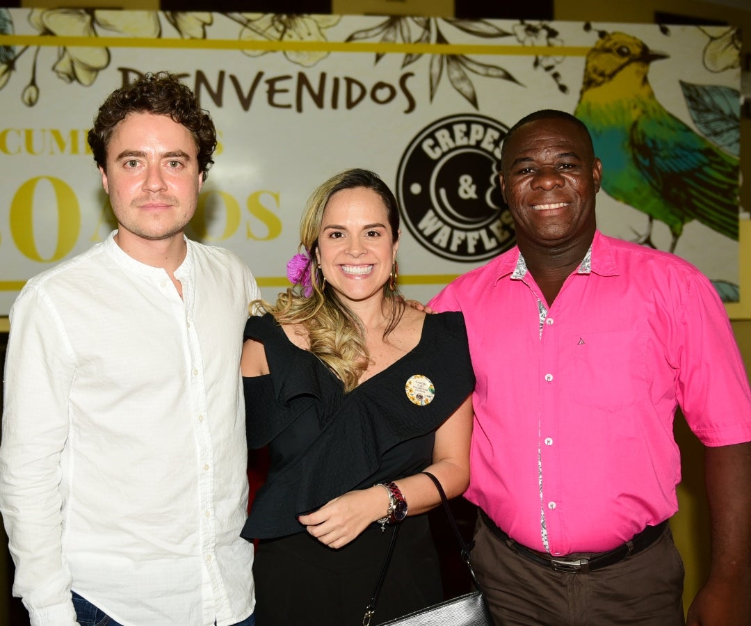 Felipe Macía, director de sostenibilidad de Crepes & Waffles; acompañado de Marcela Celis y Gustavo Mindineros, productor de cacao de Tumaco.