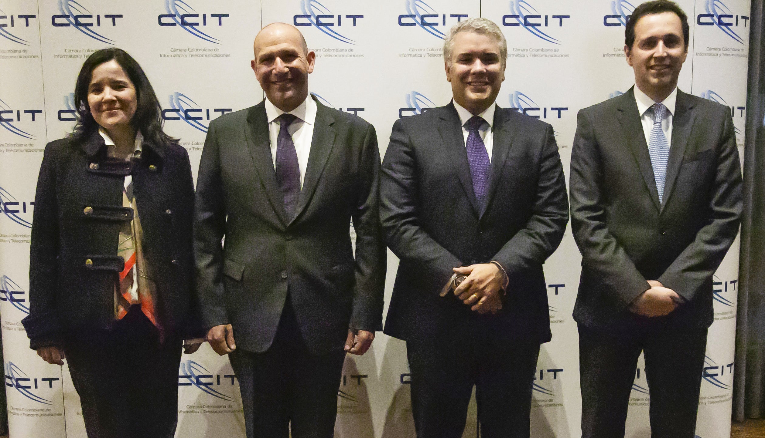 ylvia Constaín, ministra de las TIC; Alberto Samuel Yohai, presidente de la Cámara Colombiana de Informática y Telecomunicaciones; Iván Duque, presidente de la República; y Jorge Enrique Cote Velosa, presidente de Carvajal Tecnología y Servicios.