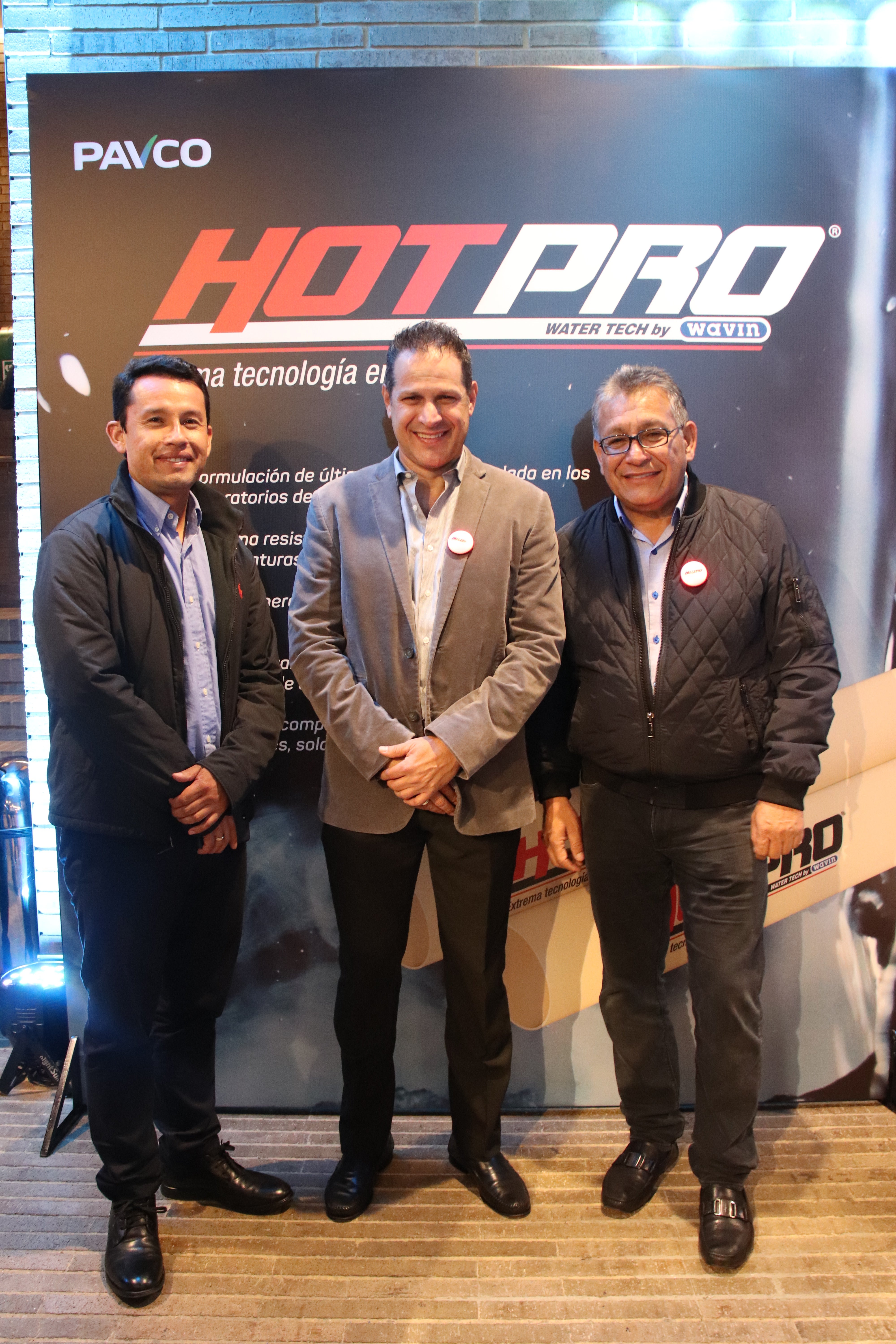 Tyron Hernández, de Redes y Montajes; Ernesto Guerrero, vicepresidente comercial de Pavco; y William Castellanos, de WC Instalaciones Hidráulicas y Sanitarias.