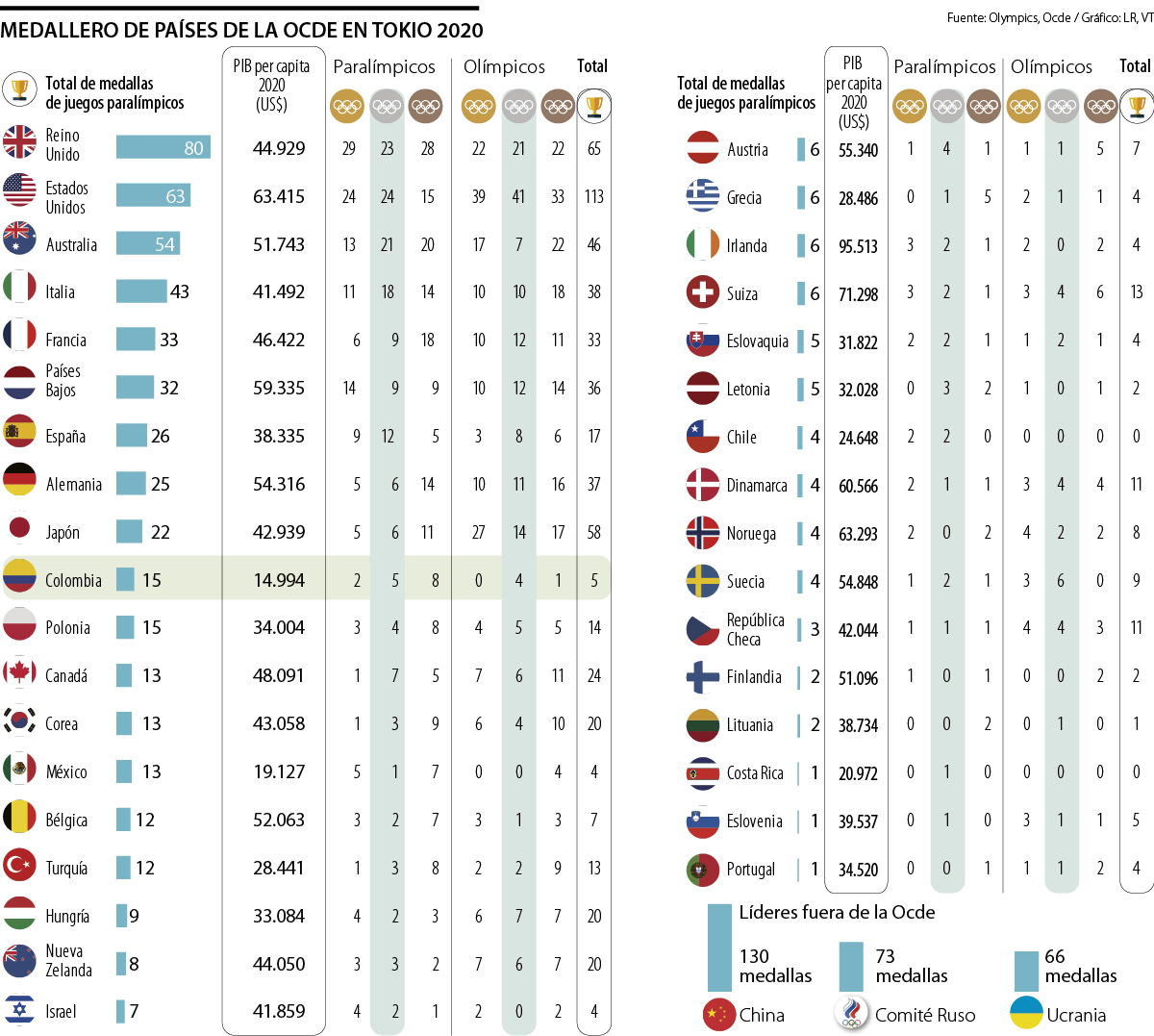 Colombia está en décima posición entre los países de la Ocde con más medallas, aunque es de las naciones con menor PIB per cápita