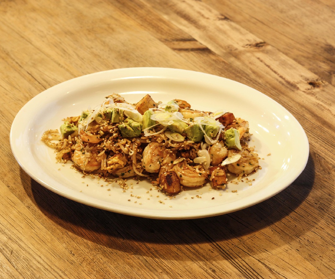 Esta propuesta gastronómica consta de arroz de influencia china, salteado en aceite de sésamo, con camarones en salsa de patrono y jengibre, plátano maduro y cebollitas crujientes.