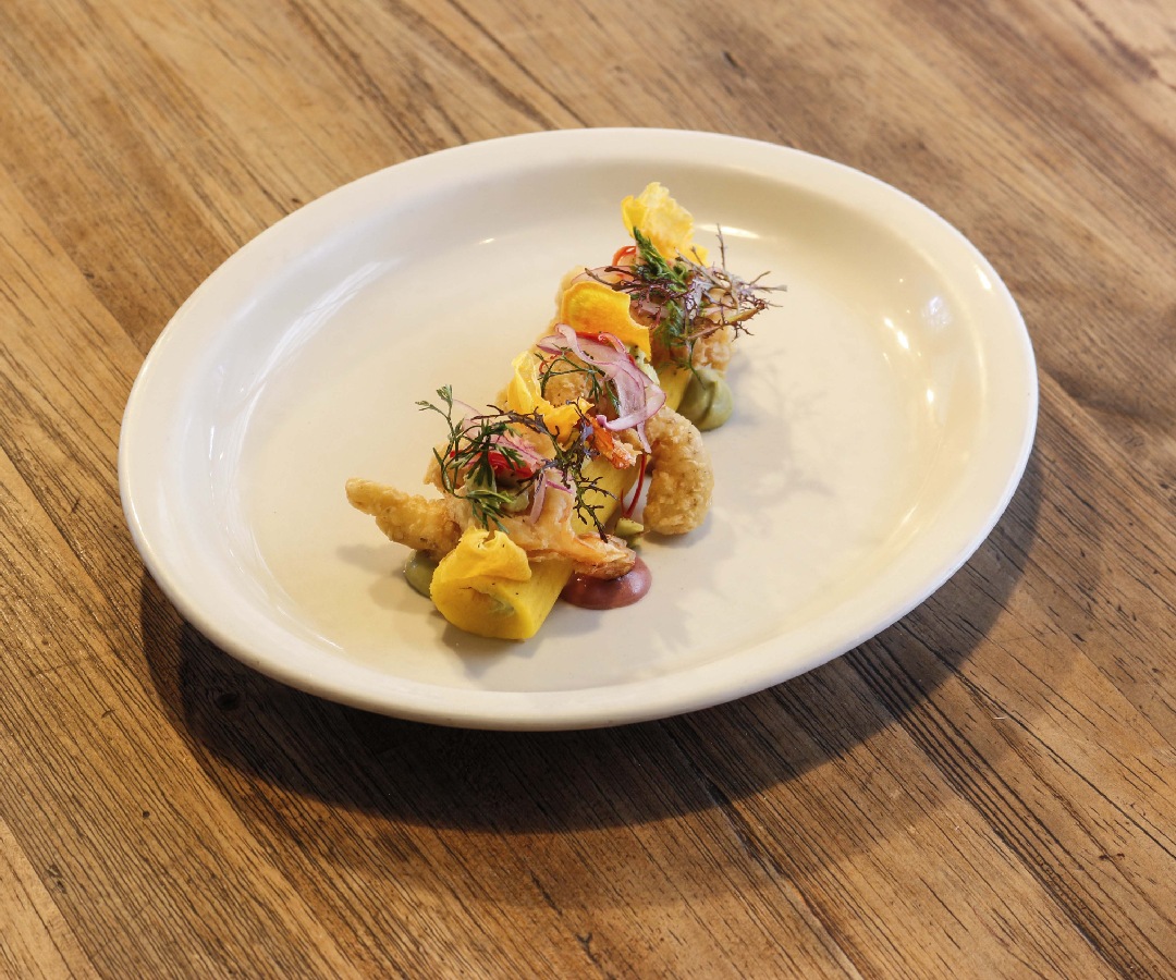 Este plato incluye langostinos marinados en leche de tigre y arrebozados, montados sobre causa, alioli de aguacate, mayo de olivas y chips de camote. La causa de langostinos es una entrada fría ideal que ofrece este restaurante.
