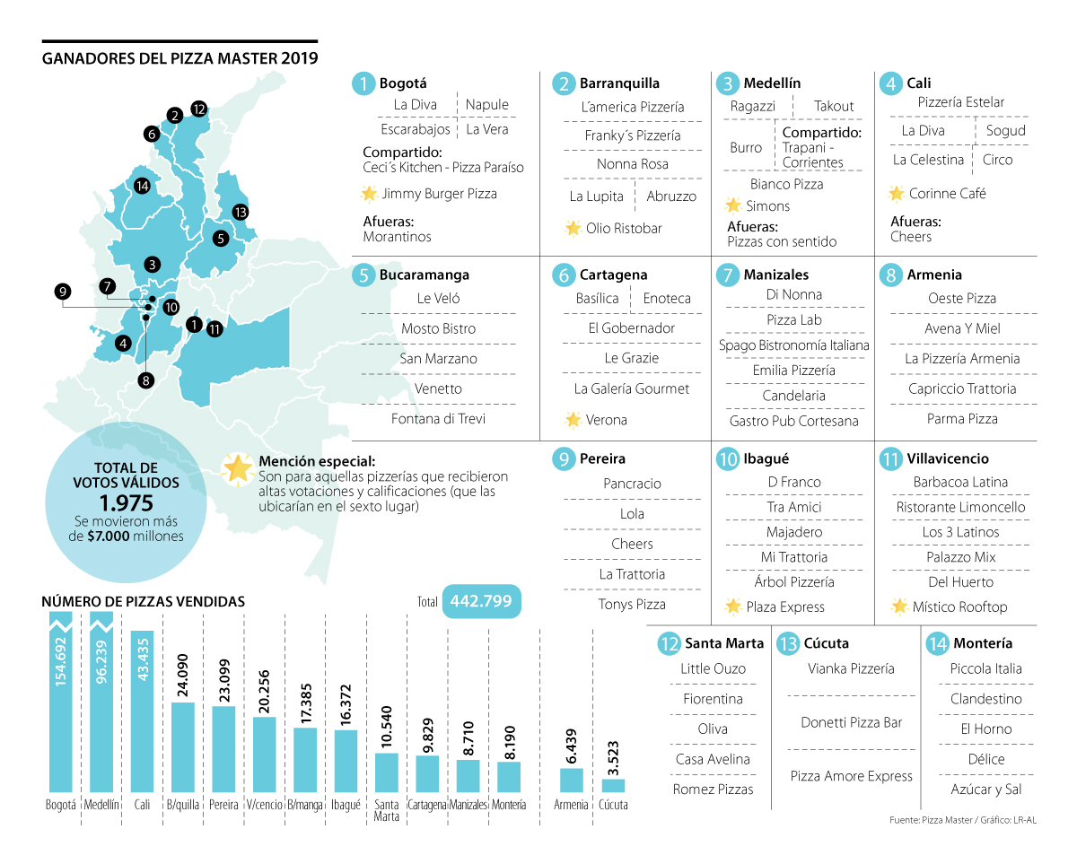 En Bogotá, los primeros lugares los ocuparon La Diva y Napule; en Barranquilla, L’america Pizzería y Franky’s Pizzería; en Medellín, Ragazzi y Takout; y, en Cali, las ganadoras fueron Pizzería Estelar y La Diva.