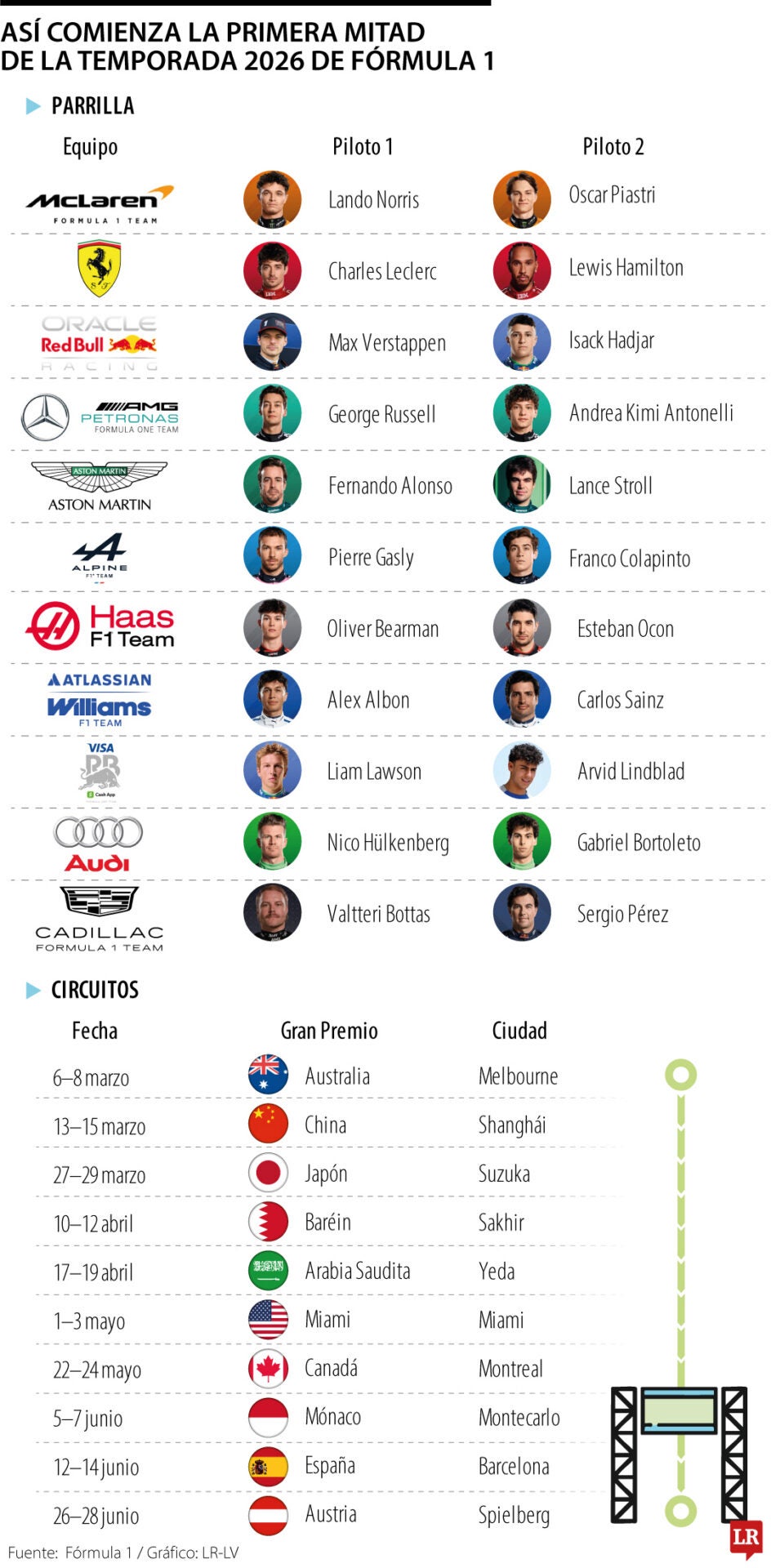 También hay expectativa alrededor de Aston Martin, que sigue contando con Fernando Alonso, y del debut de Cadillac, que se suma a la parrilla con Valtteri Bottas y Sergio Pérez, ampliando el número de equipos y reforzando la presencia norteamericana en la categoría.