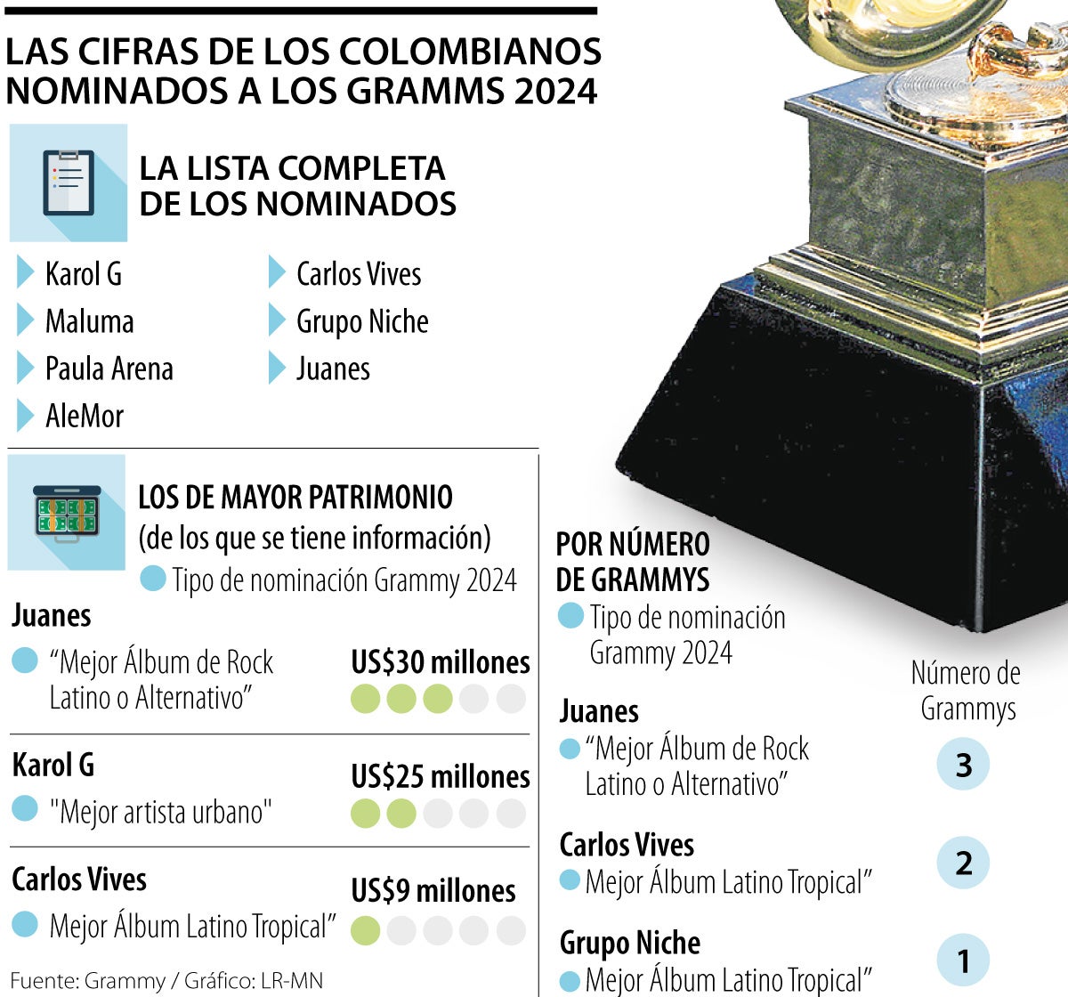 Aunque la muestra no es significativa, muchos de ellos ya tienen un gramófono encima. Pero más allá de eso, en este listado, hay entre artistas nuevos y viejos, algunos con los patrimonios netos más altos entre artistas. Juanes es el artista colombiano, nominado a los Grammy 2024, con mayor número de premios acumulados en este galardón y con más patrimonio neto. El artista antioqueño suma tres gramófonos y tiene una riqueza estimada en US$30 millones. A este le sigue, por riqueza, Karol G (US$25 millones), sin embargo, la cantante no ha ganado ningún Grammy Anglo. Luego en la lista de más nominados con más patrimonio está Carlos Vives, con US$9 millones y dos Grammy ganados.