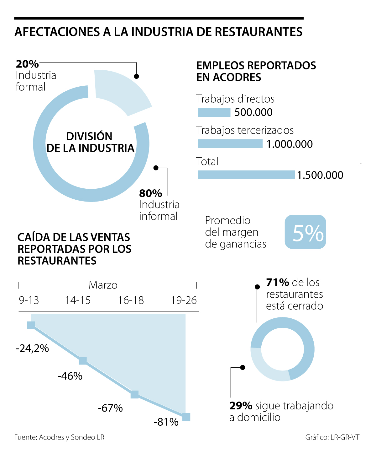 Ahora bien, en Colombia uno de los sectores más afectados es el gastronómico, ya que son establecimientos comerciales que viven de sus ingresos diarios. Según declaraciones del presidente de la Asociación Colombiana de la Industria Gastronómica (Acodres), Henrique Gómez París, han visto que las ventas han tenido caídas continuas que no han logrado recuperarse y que además traerán problemas serios para la industria que se seguirán evidenciando los próximos meses.