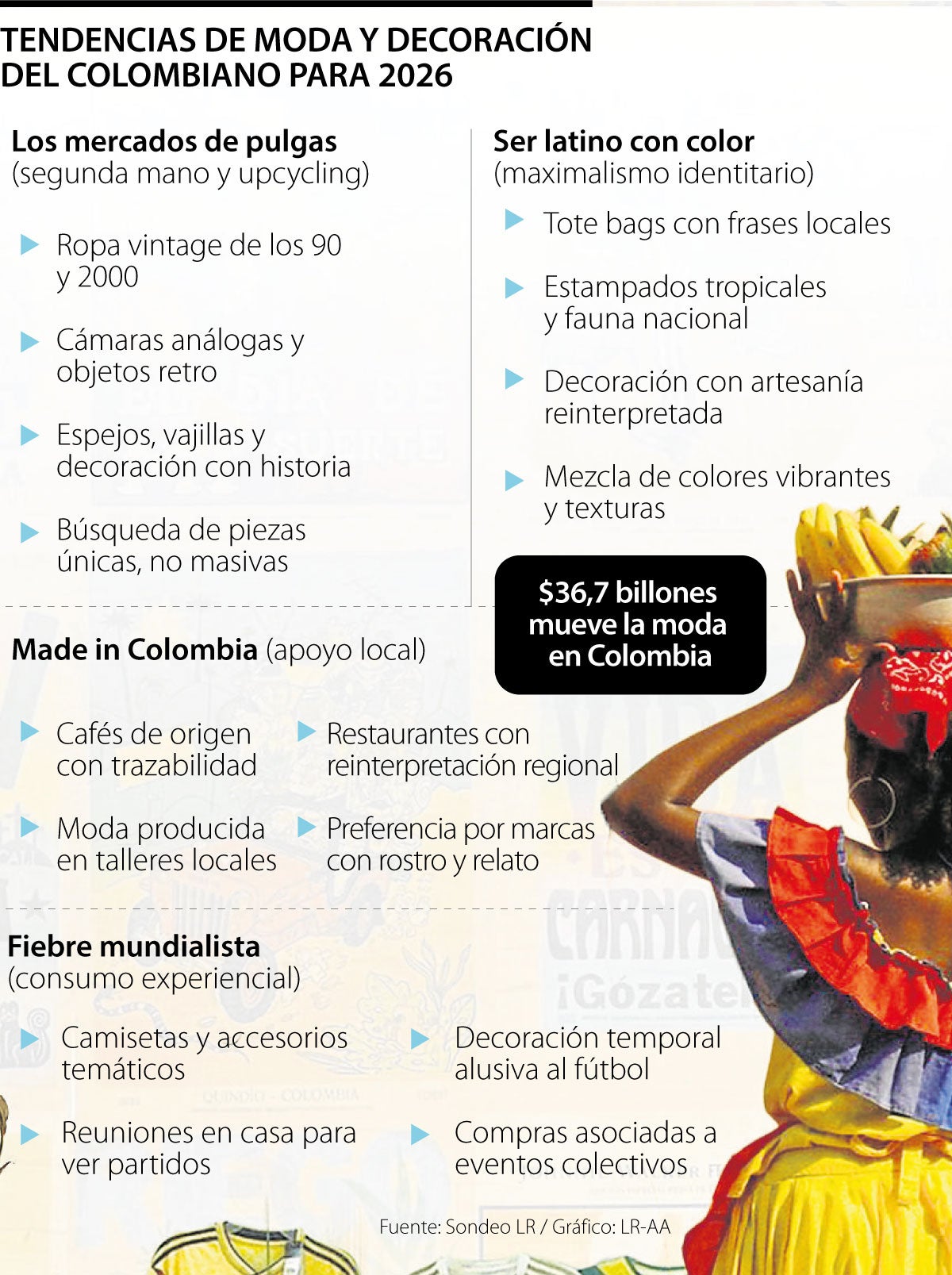 El gasto de los hogares en moda cerró 2025 en $36,7 billones, con un crecimiento anual de 10,3%, según el Observatorio de Moda. Solo en diciembre el mercado alcanzó $4,10 billones. Más que un aumento en el consumo, estas cifras reflejan una transformación en la manera en que los colombianos se visten, decoran y construyen identidad. Estas son las tendencias que explican hacia dónde va el estilo en Colombia en 2026.