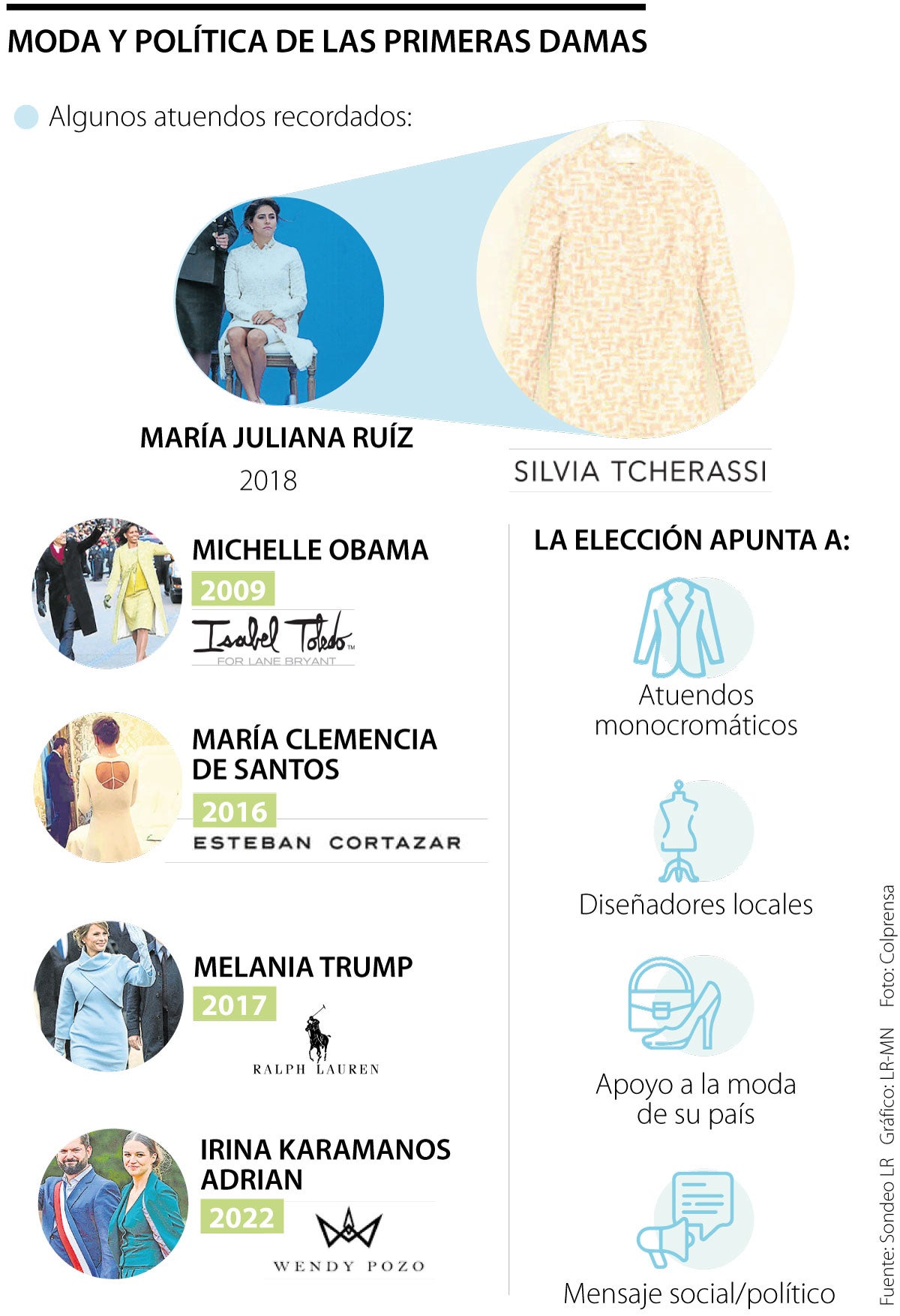 En el caso de María Juliana Ruiz, primera dama de Colombia, por ejemplo, para la ceremonia de posesión del presidente Iván Duque en 2018, usó un vestido Silvia Tcherassi en tonos crema, y cuando visitó la casa blanca, usó una chaqueta en un menta pastel de los diseñadores colombianos Francisco Leal y Karen Daccarett.