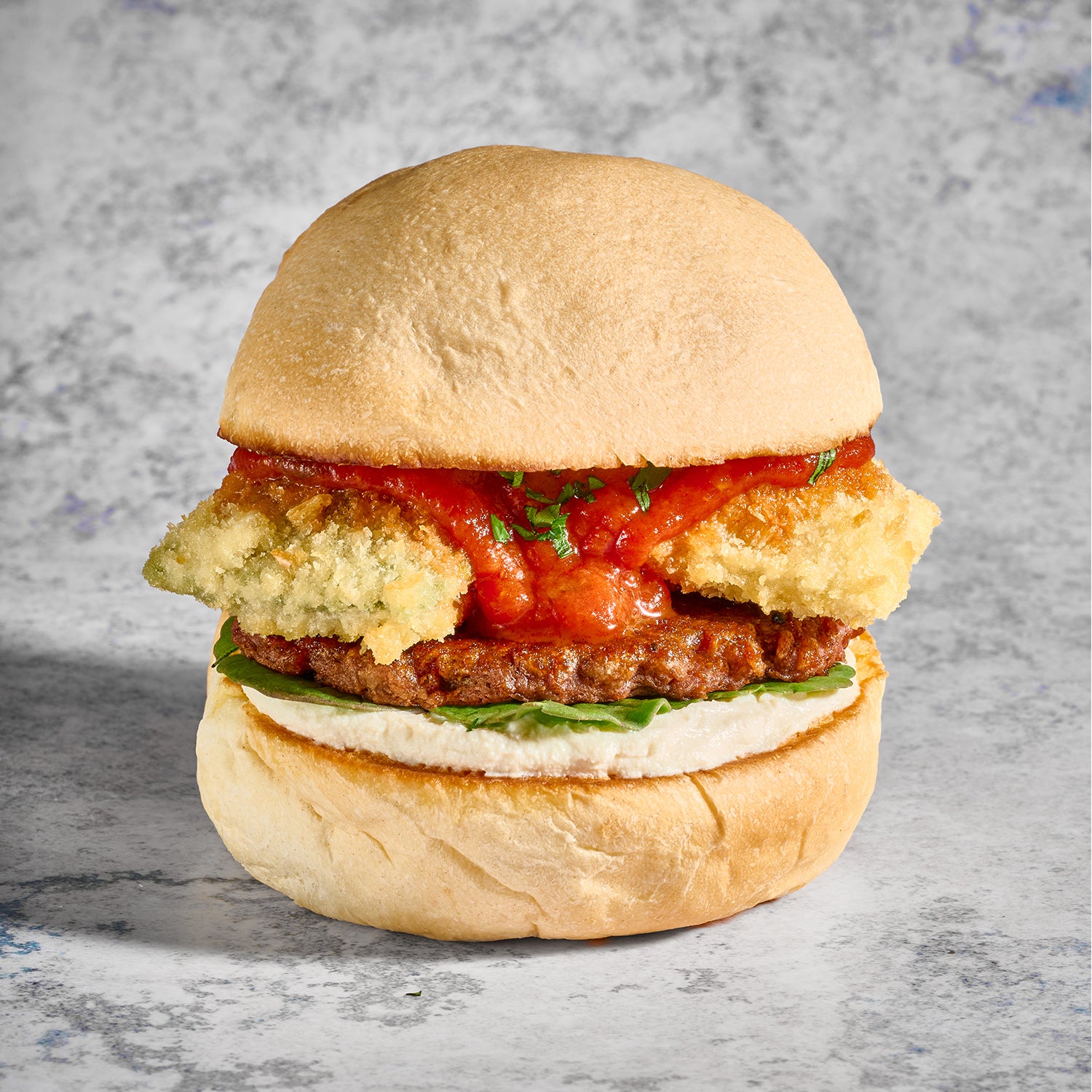 Hamburguesa inspirada en la gastronomía italiana. Pan artesanal, NotBurger tipo smash, raviolis apanados de tofu, espinaca y alcachofa de Puerto Sur. Viene con crema de ricotta vegana, rúgula, salsa arrabbiata y perejil.