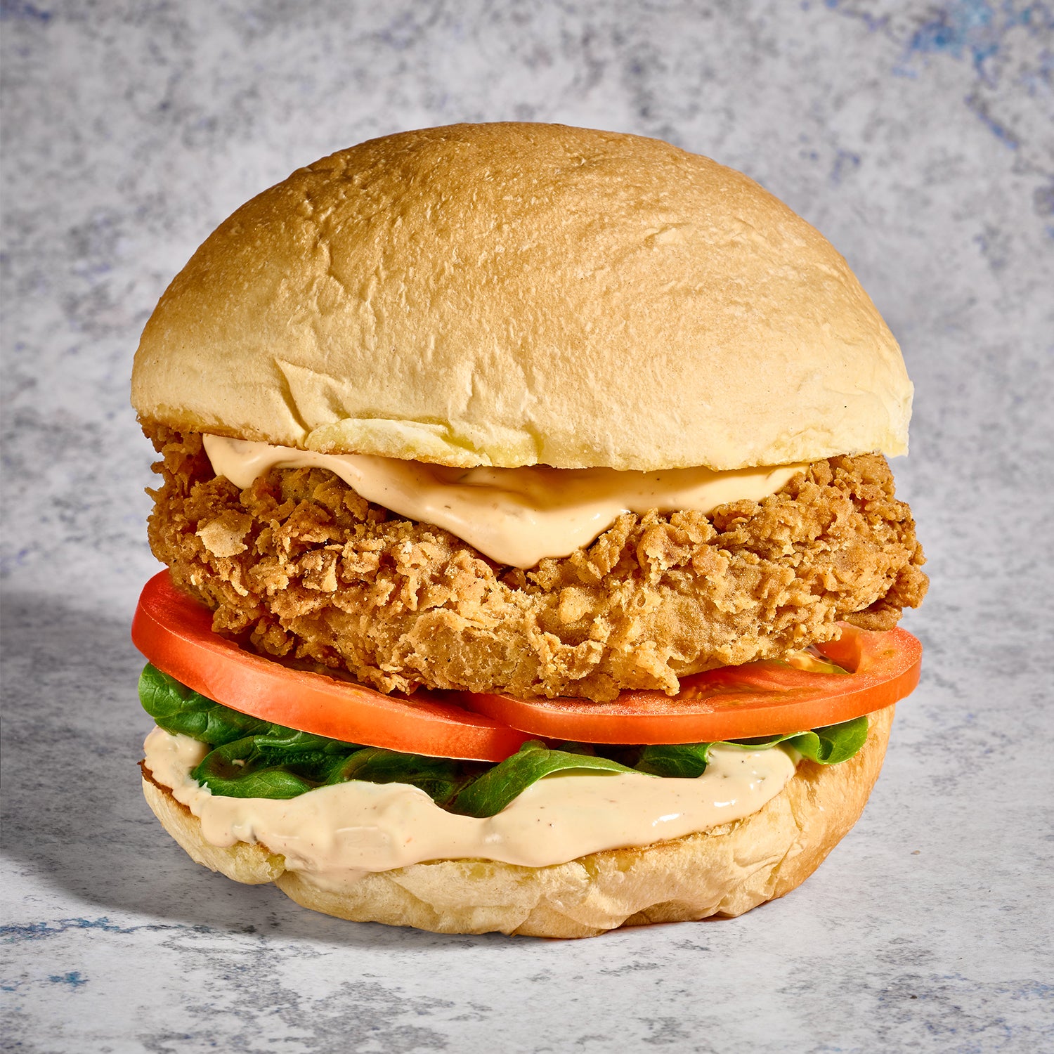 Se trata de una hamburguesa con pan artesanal, proteína que simula la carne de pollo apanada, y que es hecha por el restaurante con el uso de la inteligencia artificial. Viene acompañada de lechuga, tomate y salsa deluxe.