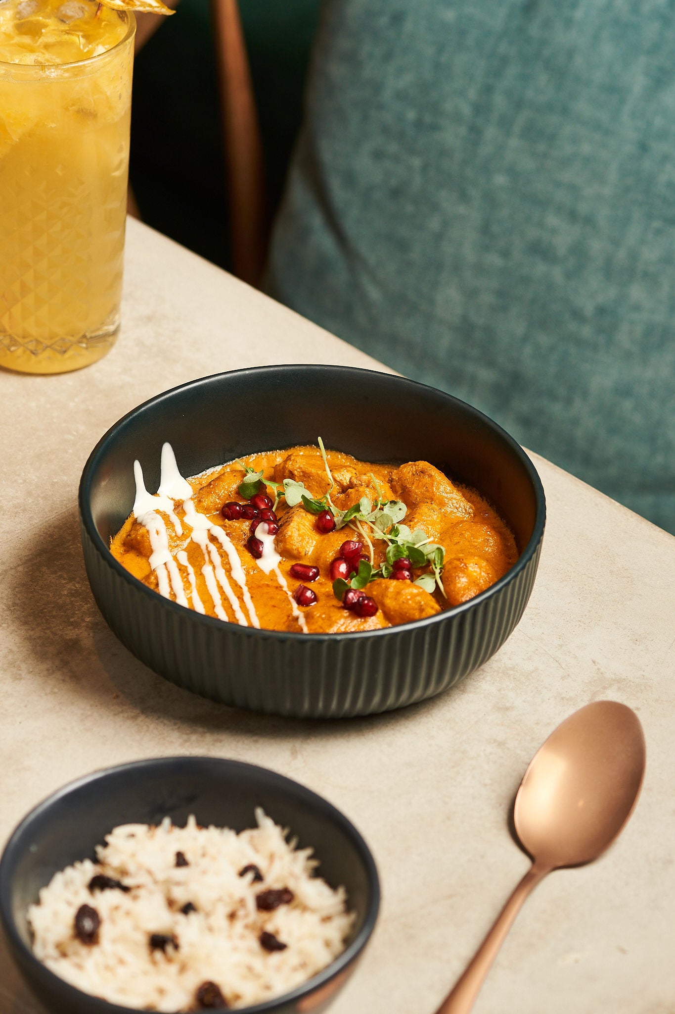 Trozos de pechuga de pollo, adobados al estilo indio con yogurt griego y especias. Servido en una salsa cremosa aromatizada con tomates frescos. Acompañado con semillas de granada que al paladar hacen una explosión de sabores.