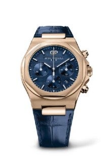 El reloj de la línea Laureato en color oro/azul presenta un calibre GP03300 y movimiento automático. Con una reserva de marcha de 54 horas y 63 joyas, su diámetro es de 42 mm y un espesor de 12,01 mm. Su hermeticidad es de 100 metros y cuenta con un brazalete de piel de cocodrilo con cierre triple.