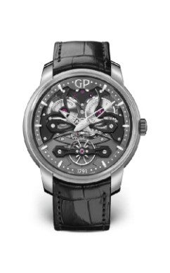 Este reloj en color plata está equipado con el calibre GP01800-0006 y un movimiento automático, ofreciendo una reserva de marcha de 54 horas. Con 25 joyas, presenta un diámetro de 42 mm y un espesor de 10,68 mm, con una hermeticidad de 100 metros, la carátula es esqueletada y permite ver el mecanismo.