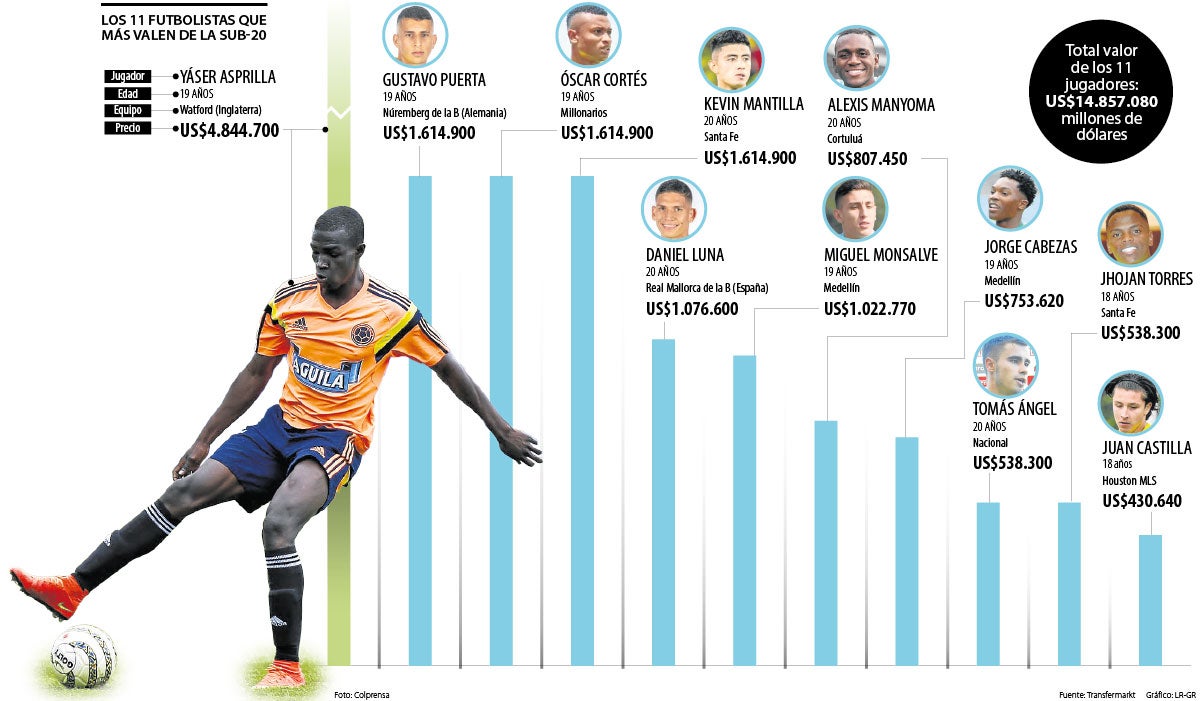 Yáser Áser Asprilla, el talentoso que milita en el fútbol inglés, es el más cotizado con un valor de US$4,8 millones. El precio de todos sube considerablemente