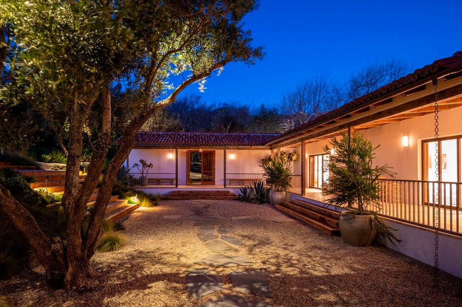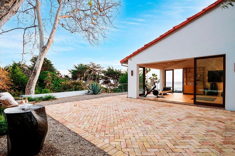 Entrando por la puerta principal, un camino serpenteante conduce a la deslumbrante vivienda. Está construida en el centro de una gran parcela de más de 12.000 metros cuadrados con majestuosos enebros que protegen la privacidad de sus moradores. La parcela limita por un lado con la famosa Pacific Coast, una de las autopistas más fotografiadas de Los Ángeles, protagonista de numerosas escenas de películas, y por otro con la playa El sol, una de las más exclusivas de Malibú, a la que tiene acceso privado a través de una pasarela de madera que desciende por el acantilado hasta la arena.