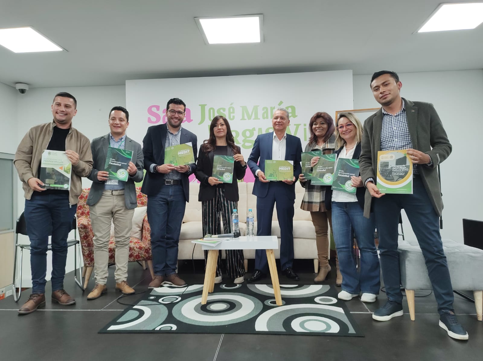 Foto: Víctor Londoño, vicerrector académico; Diego Hernández, docente seccional Facatativá; Manuel González, profesional campo de aprendizaje Viviendo el Medit; María Garzón, decana ciencias de la salud; Adriano Muñoz, rector; Olga Norato, directora de investigación Institucional; Myriam Sánchez, vicerrectora administrativa y financiera; y Michael Vargas, profesional Campos de Aprendizaje Cultural.