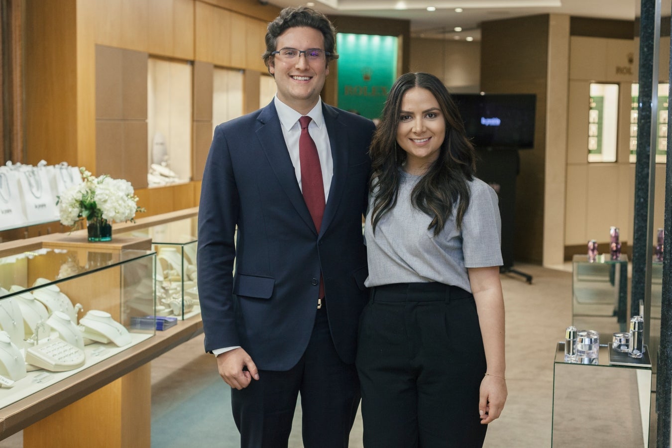 Thomas Kling, gemólogo de la joyería Bauer, y Jennifer Boada, brand manager de La Prairie.