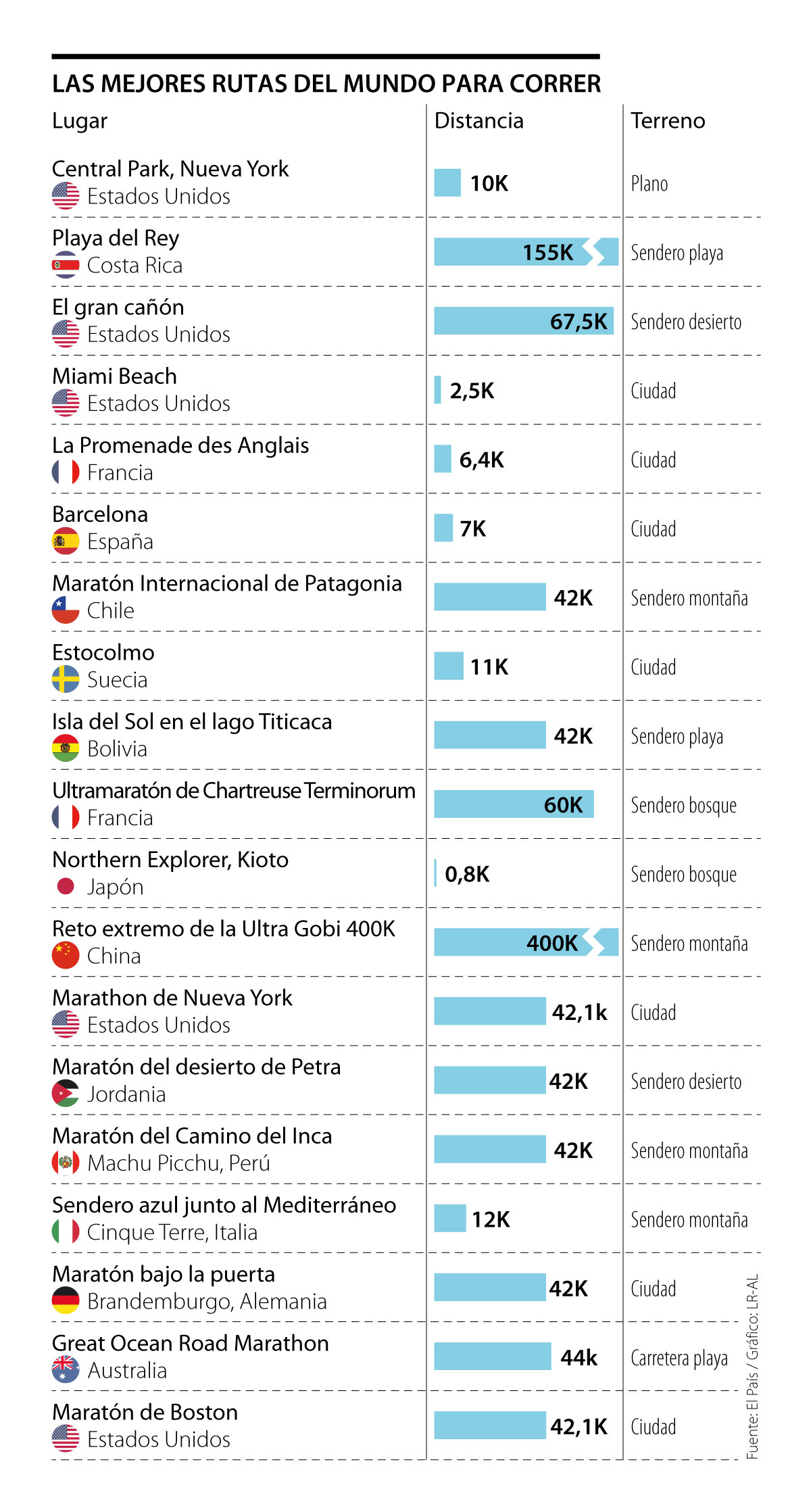 El libro de Lonely Planet hizo un ranking de los mejores lugares del mundo para practicar running, entre estos hay algunos con rutas fáciles y sencillas que no superan el kilómetro de distancia, hasta algunas que incluso llegan a los 400k.