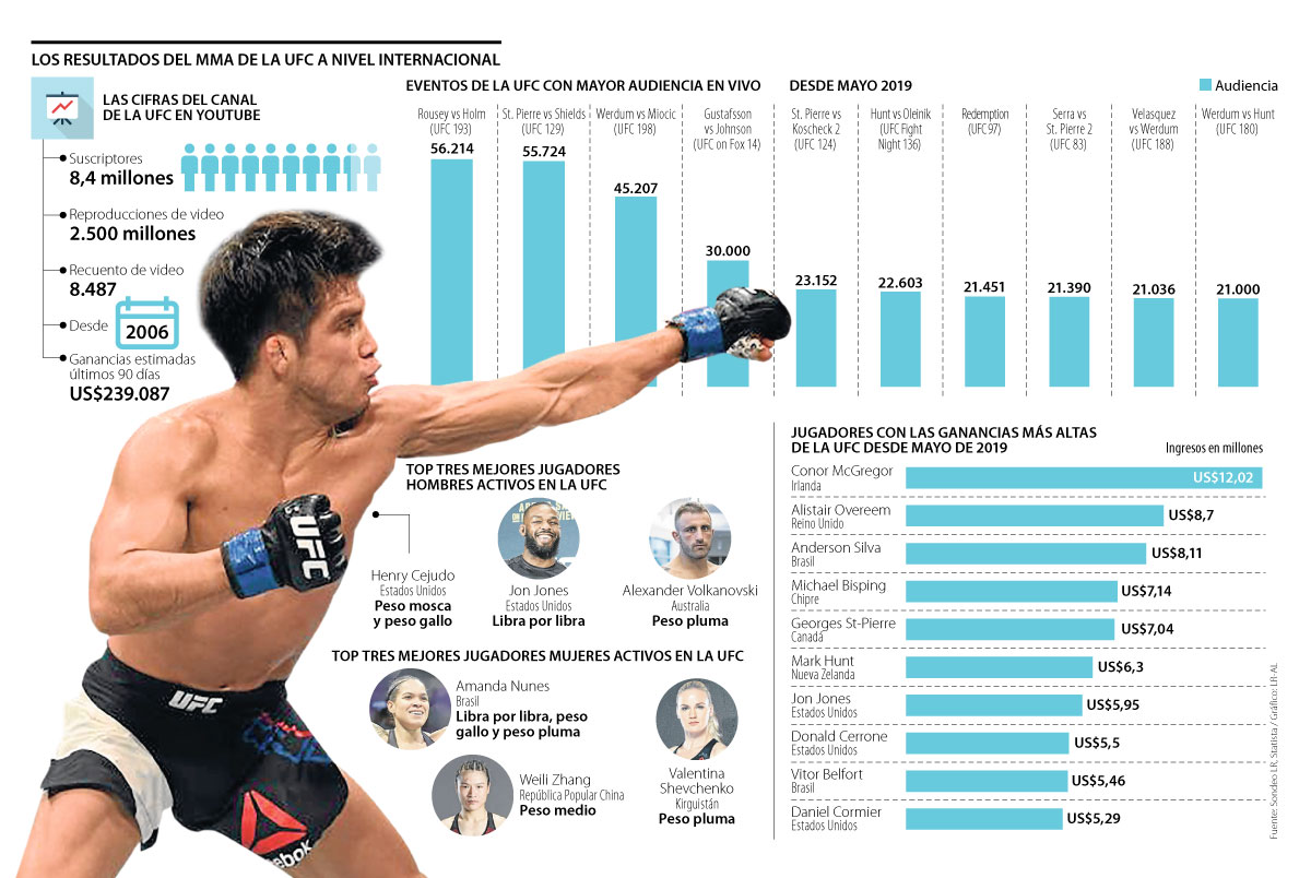 Las luchas de esta disciplina están organizadas por diferentes organizaciones, pero la principal y más grande empresa que integra deportistas de distintas nacionalidades y eventos internacionales es la Ultimate Fighting Championship (UFC), que según datos de Statista pasó de tener una valoración cercana a los US$2.000 millones a 2017 a más de US$4.000 millones hoy en día.