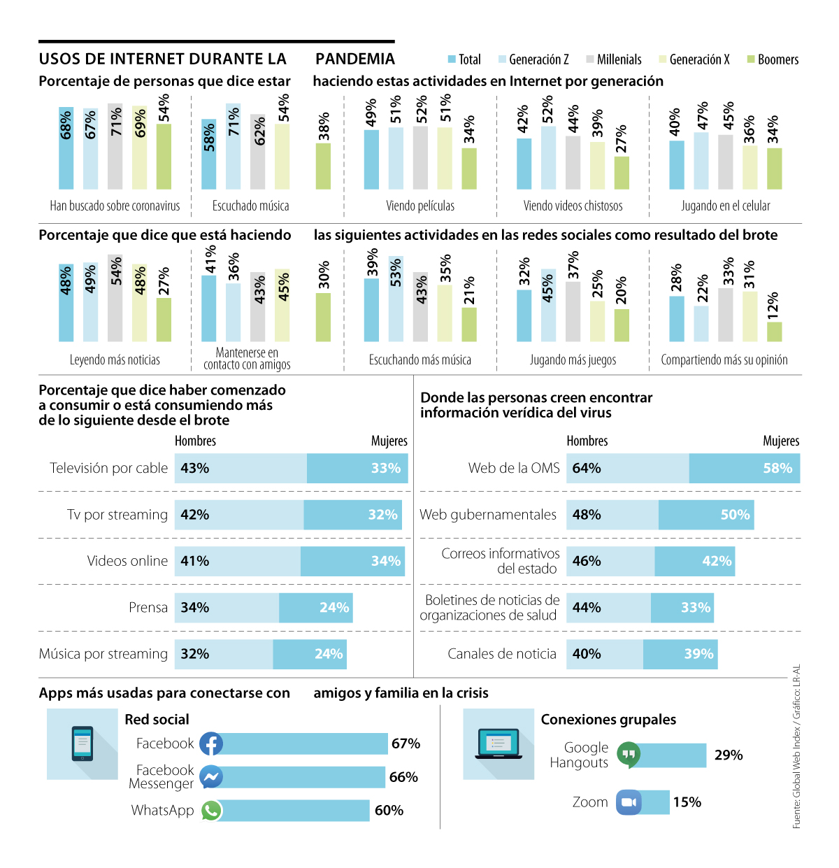 Internet y en particular las redes sociales se han convertido en herramientas de trabajo y vida cuyas tendencias de uso han cambiado de manera significativa. El Global Web Index encontró que hoy lo que más hacen las personas en internet es buscar sobre coronavirus en un 68%, escuchar música 58%, ver películas 49%, ver videos chistosos 42%, y en quinto lugar, jugar en el celular con 40% del total.