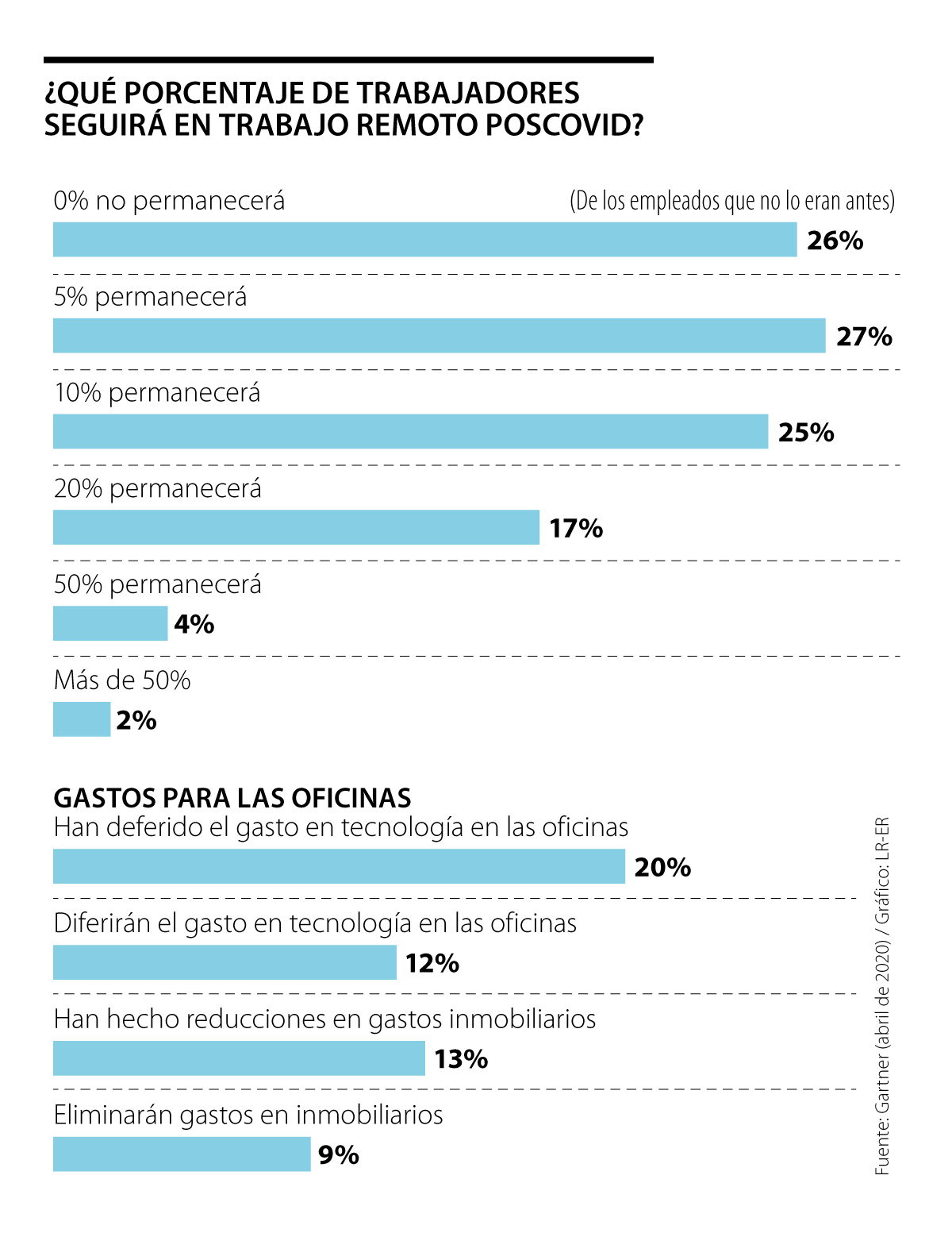 El documento tiene en cuenta la encuesta de Gartner que se realizó a 317 directores y líderes financieros el 30 de marzo de 2020, y que reveló que 74% trasladará al menos 5% de su fuerza laboral de puestos permanentes a remotos después de superar la pandemia de covid-19.
