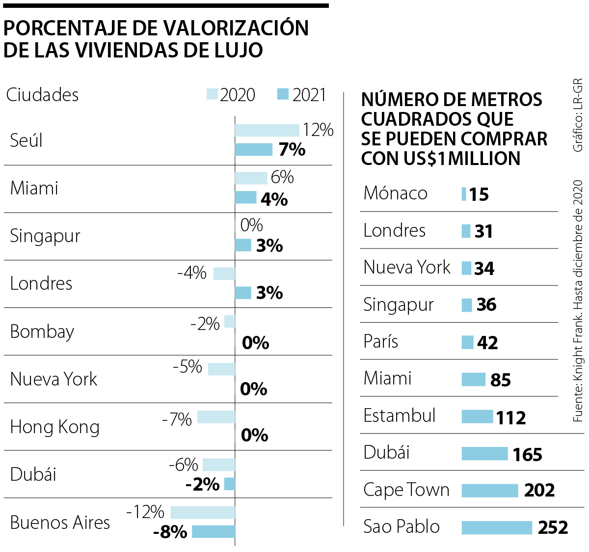 Con US$1 millón se pueden comprar 165 metros cuadrados de espacio en Dubái, unas cinco veces más que en Londres o Nueva York, según Knight Frank. Se prevé que el valor de las viviendas de primera calidad, por 3,6 millones de dírhams (US$1 millón) o más, disminuya 2% en 2021, tras haber caído 6% en 2020, según estimaciones de Knight Frank.
