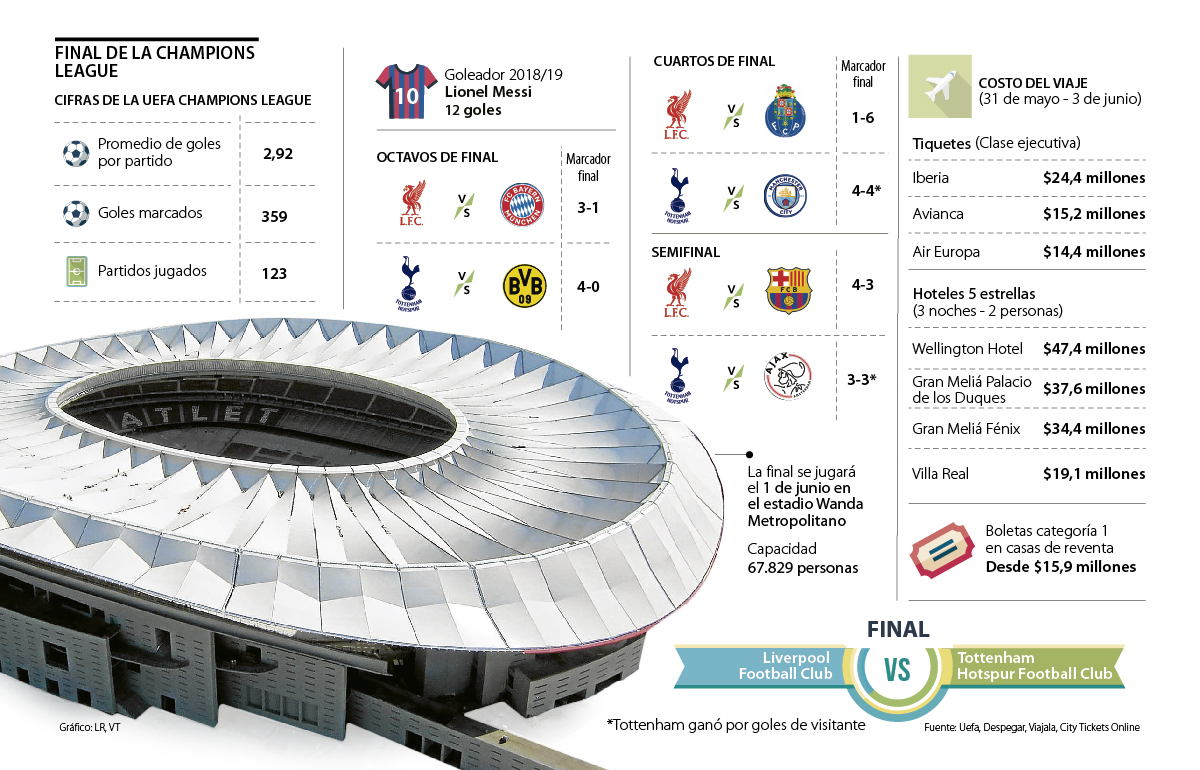 Si usted es uno de los que ha celebrado las victorias recientes del Liverpool y el Tottenham y está interesado en vivir de cerca el encuentro final de la copa el próximo 1 de junio, tendrá que hacer cuentas de rubros como los tiquetes aéreos. Si desea viajar en clase ejecutiva, la ruta Bogotá - Madrid - Bogotá tiene precios desde $14,4 millones en Air Europa, pasando por $15,2 millones en Avianca, hasta $24,4 millones en aerolíneas como Iberia.